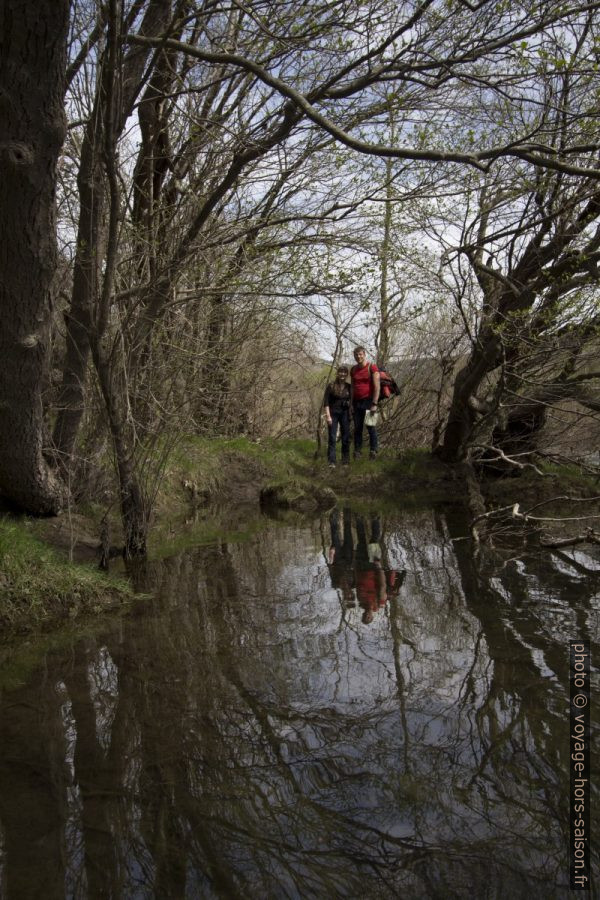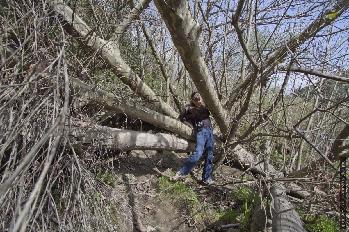 On passe des grandes flaques d’eau laissées par les dernières crues. Elles remplissent malheureusement les seuls passages libres. Uniquement les grenouilles s’en réjouissent. Pour nous c’est un labyrinthe de troncs morts dans tous les sens et d’arbres de toute taille bien enracinés. On ne passe même pas directement au bord de la rivière.