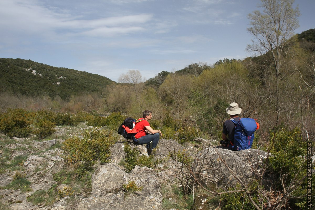 Nous avons quitté la région PACA pour revoir des amis près de Ganges. Nous troquons notre camion contre une chambre pour trois nuis, ce seront les dernières de la sorte pour plusieurs semaines. Partageant nos faiblesses pour l’eau et les endroits sauvages, nous attaquons à pied une partie peu fréquentée de l’Hérault, au sud de Causse-de-la-Selle: On descend vers le Moulin de Figuière et nous longeons en direction aval la vallée de l’Hérault où il fait se débattre avec la végétation qui est ratiboisée à chaque crue. Nous remontons par la Combe de Rastenclas qui est un vallon sec dans le calcaire des Causses.