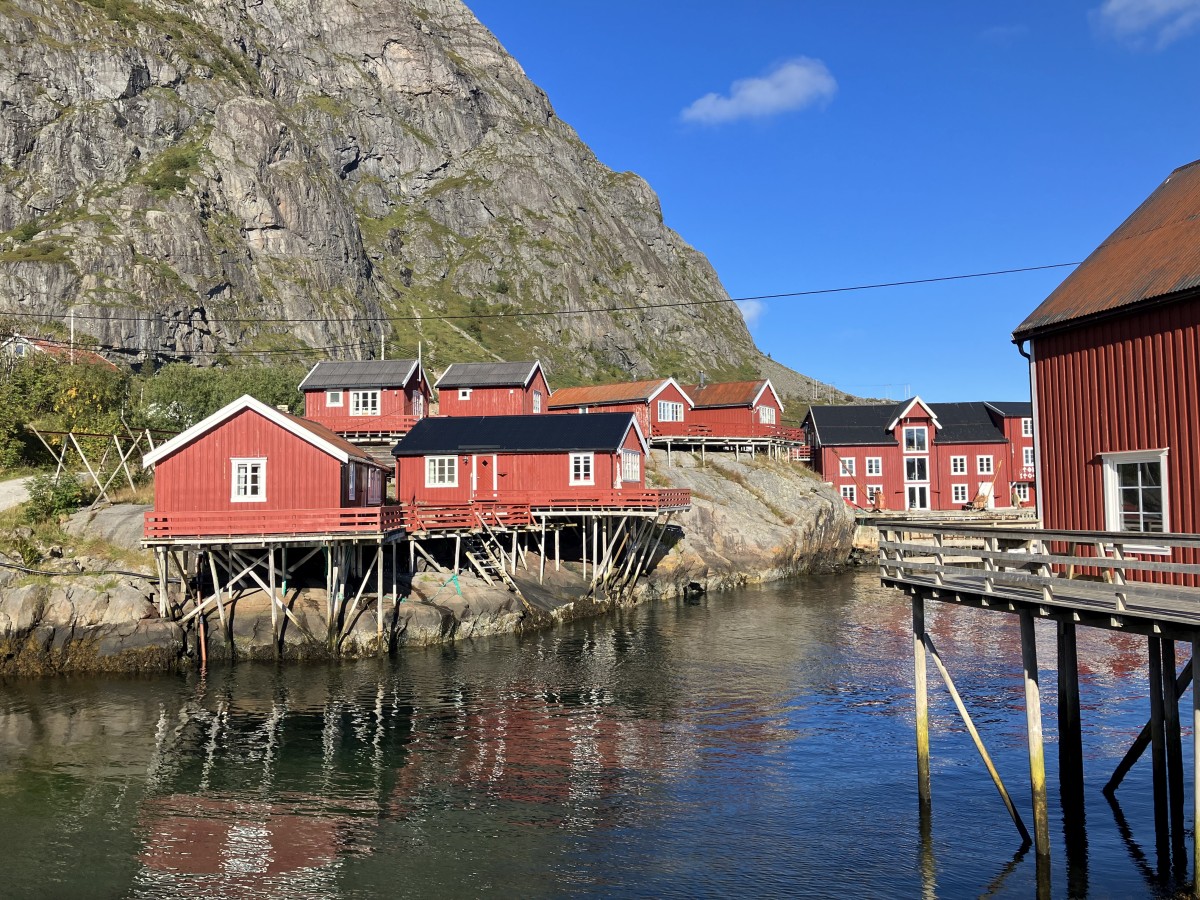 « Å » est souvent nommé « Å i Lofoten » parce que ce n’est pas le seul endroit appelé ainsi en Norvège. Sinon c’est un village entièrement touristique. La plupart des rorbuer sont à louer, le long des quais ne se trouvent plus de navires de pêche comme dans d’autres villages côtiers. Uniquement des bateaux de plaisance et de location sont visibles. Ce qui ressemble à une ancienne usine paraît désaffecté. Mais les multiples maisons rouges se détachent bien du bleu, du vert et du gris de la nature environnante. En y passant, on voit que l’on photographie toujours les mêmes maisons, il n’y en pas tellement en somme.