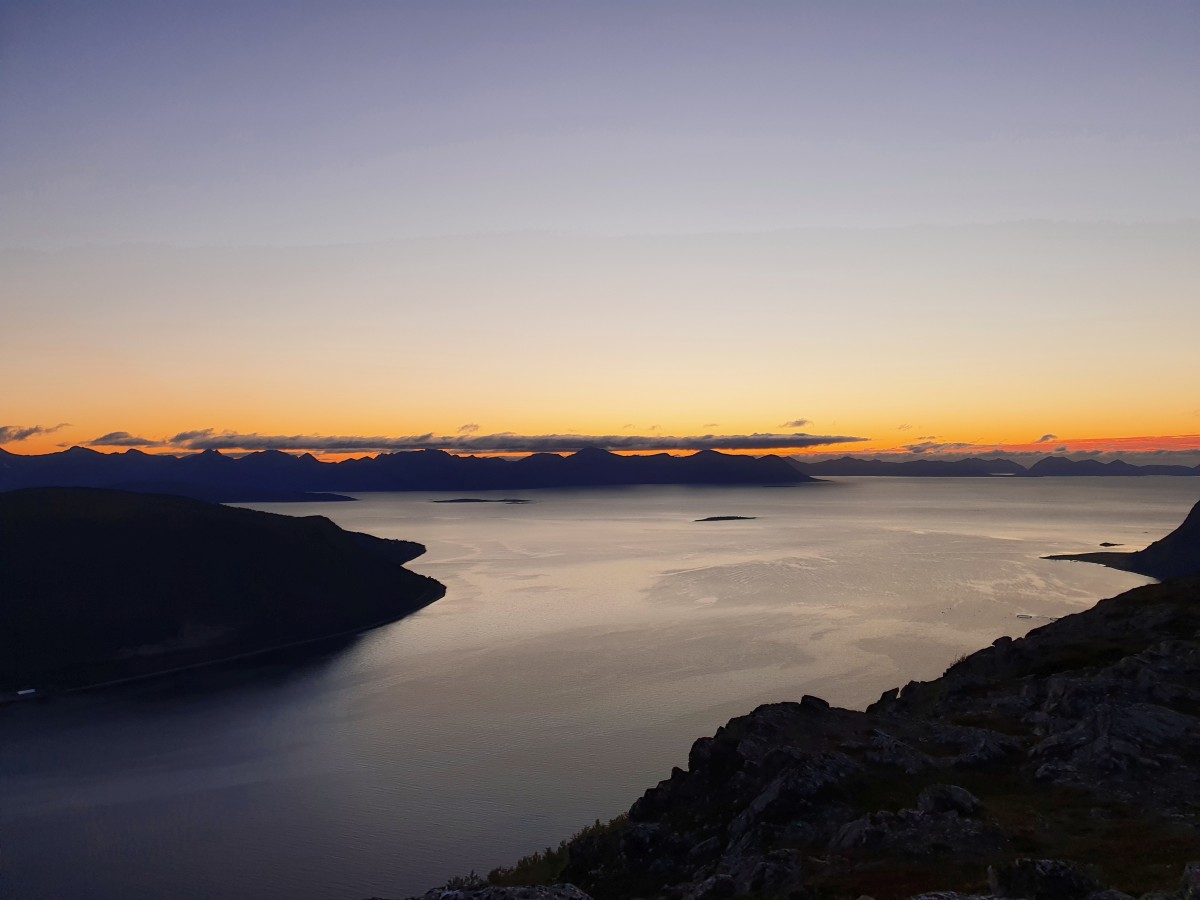 Le vrai coucher de soleil devait se passer derrière les montagnes de Myrland, c’est sur la photo à gauche. On arrive bien sûr beaucoup trop tard, mais la vue est quand même belle. Il n’y a presque pas de vent, nous sommes réchauffés de la montée rapide.