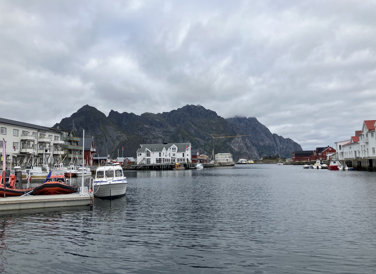 On a pris un peu de distance de la ville. Elle reste surplanté du massif montagneux de Vågakallen (au fond avec le sommet dans les nuages).