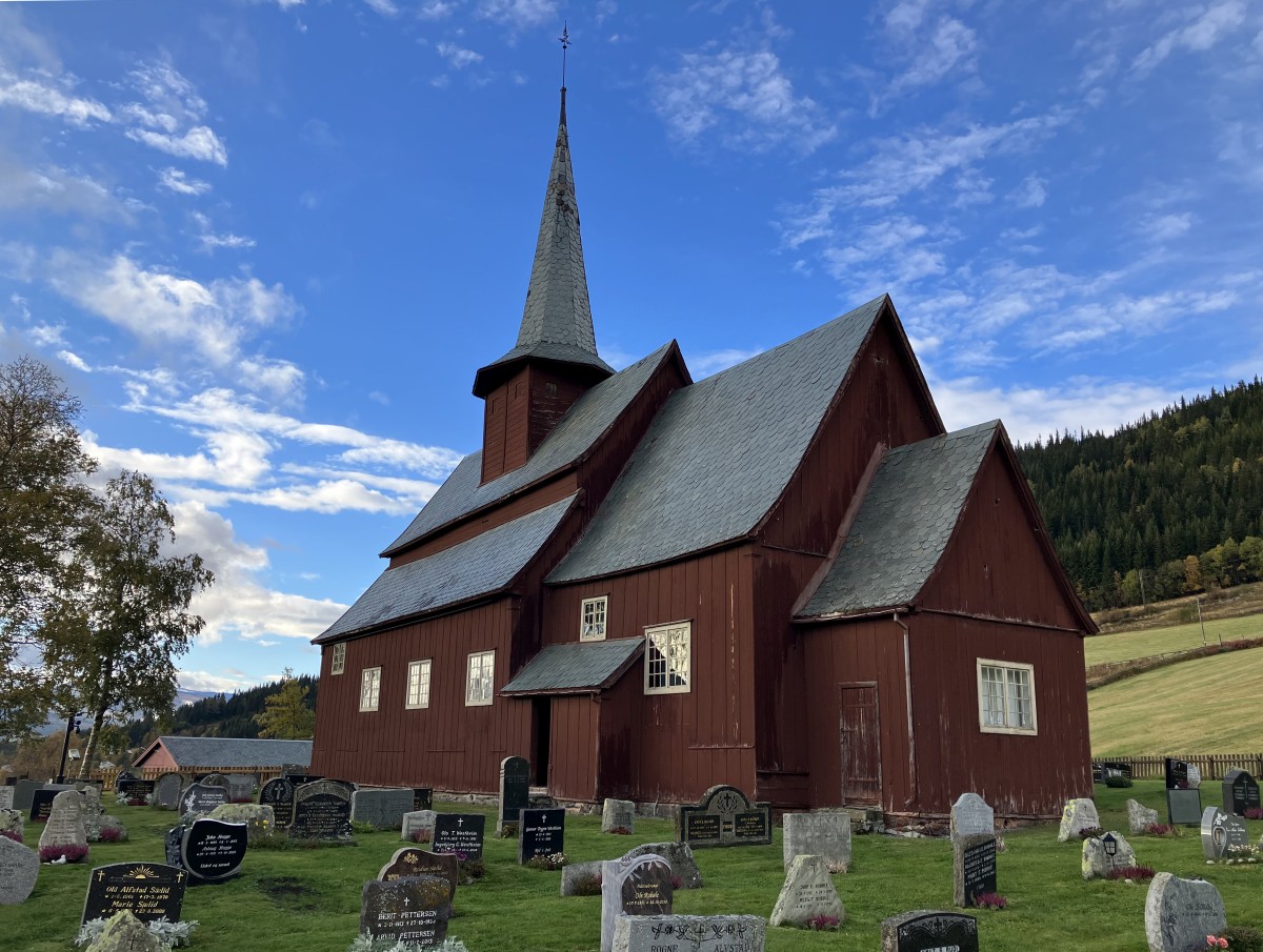 Nous descendons du fjell Valdresflye sur la route 51 ce 23 septembre 2022 et nous voyons un panneau vers l’église de Hegge sur la commune de Øystre Slidre. Il ne pleut pas, il y a même quelques bouts de ciel bleu. nous nous arrêtons donc.