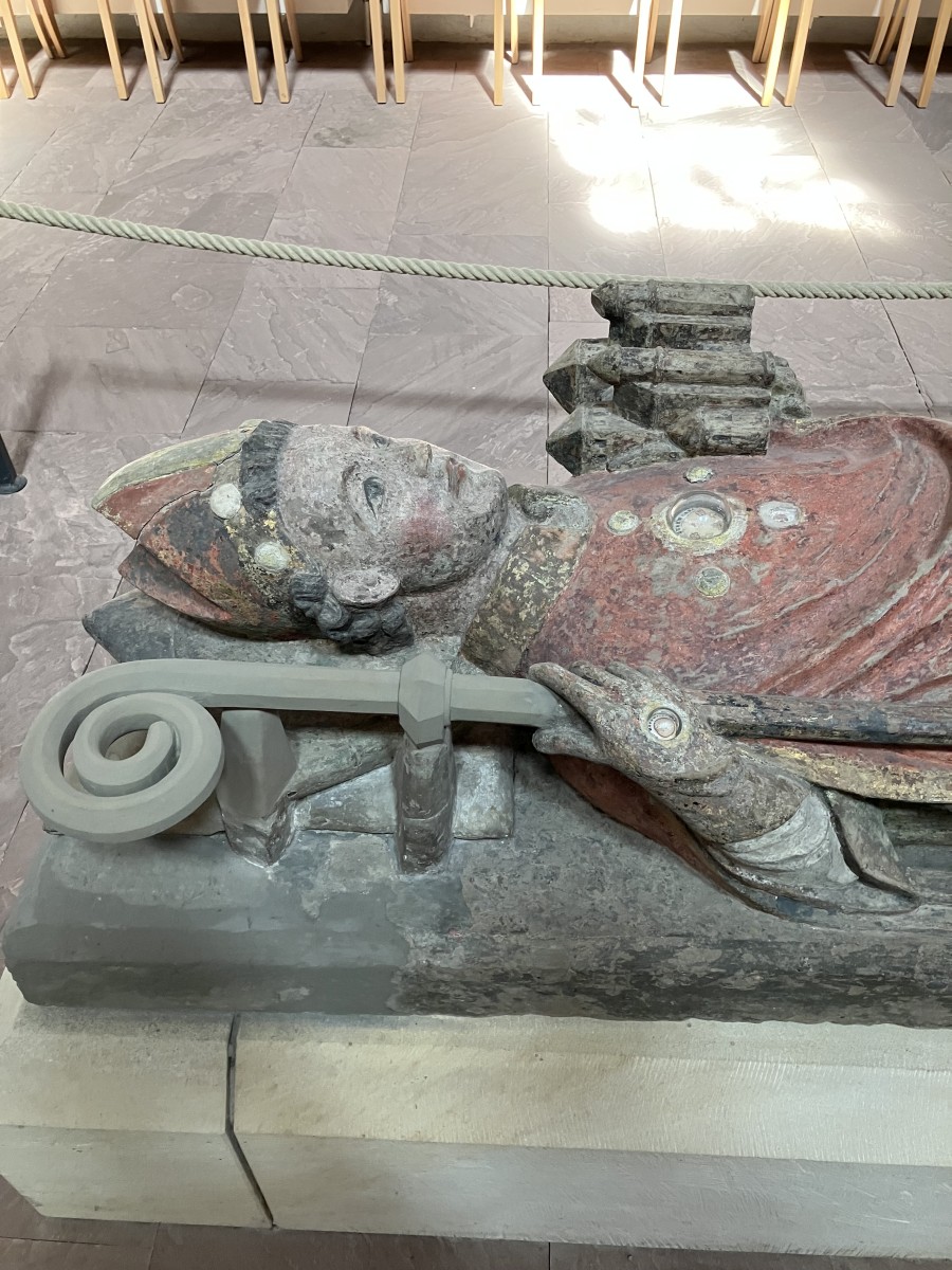 On constate également un développement de la crypte-halle de plain-pied avec la nef: autel dédié à la Vierge et à tous les Saints, la salle centrale est subdivisée par huit colonnes. De grosses piles maçonnées délimitent le déambulatoire. L’accès à la crypte se fait par deux entrées latérales, au nord et au sud. De petites niches régulières sont formées dans les murs du déambulatoire. Des salles annexes sont visibles dans l’élévation. Le chœur occidental est plus développé, par une grande abside à l’ouest, en opposition avec une abside pourvue de deux absides latérales à l’est. Source: Wikipédia.