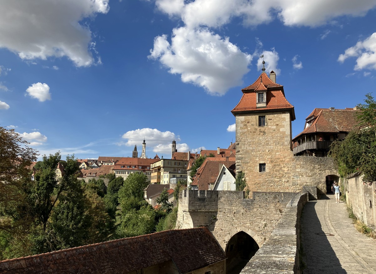 Rothenburg ob der Tauber range parmi les villes touristiques importantes d’Allemagne. Construite au bord de gorges verdoyantes, une grande partie de son centre médiéval de maisons colorées est conservé tout comme son mur d’enceinte couvert que l’on peut parcourir en grande partie. On en a des vues inégalés sur la ville. C’est le but principal de la journée du 24 août 2022 pour André après l’arrêt imprévu à Dalkingen.