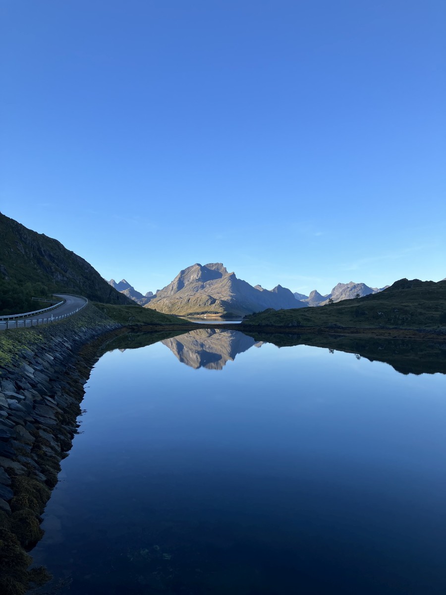 Nous passons la petite ville de Flakstad sans nous arrêter. On passe aussi la plage de Ramberg parce qu’elle est encore complètement à l’ombre à cet heure. On passe un fjord complètement repli de sable, le Skjelfjordeidet et on contourne la montagne Vorlandstinden. On entre ici dans Selfjorden par le nord-est. Des îles et la route forment des zones d’eau plate en bordure de la côte. Nous nous arrêtons à Finnbyen parce que le reflet de la montagne Narvtinden  est trop beau.
