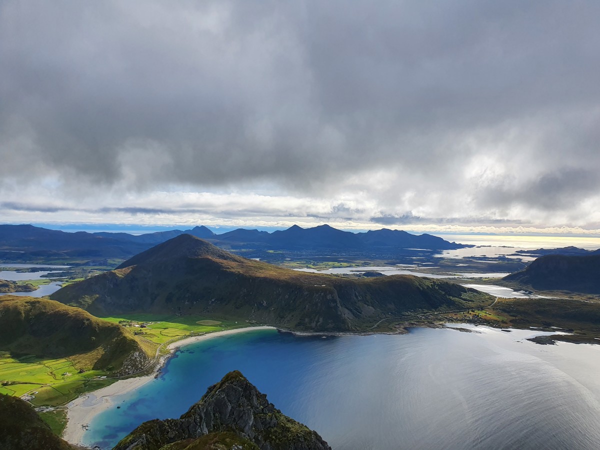 Veggen est une montagne avancée dans un des caps du nord-ouest de l’île de Vestågøya. On la voit très bien de notre maison de location de l’autre côté du chenal entre Vestågøya et Flakstadøya. Cette montagne sépare aussi les plages de Utakleiv et de Haukland qu’Alex et André explorent en même temps. Ce ne sont que Nicolas et Frederik qui montent le 7 septembre 2022 sur un sentier pas forcément visible. Les quelques 500 mètres se montent plus ou moins d’une traite. La seule descente durant la montée est vers le point de vue Nonshammaren au nord du sommet Veggen.