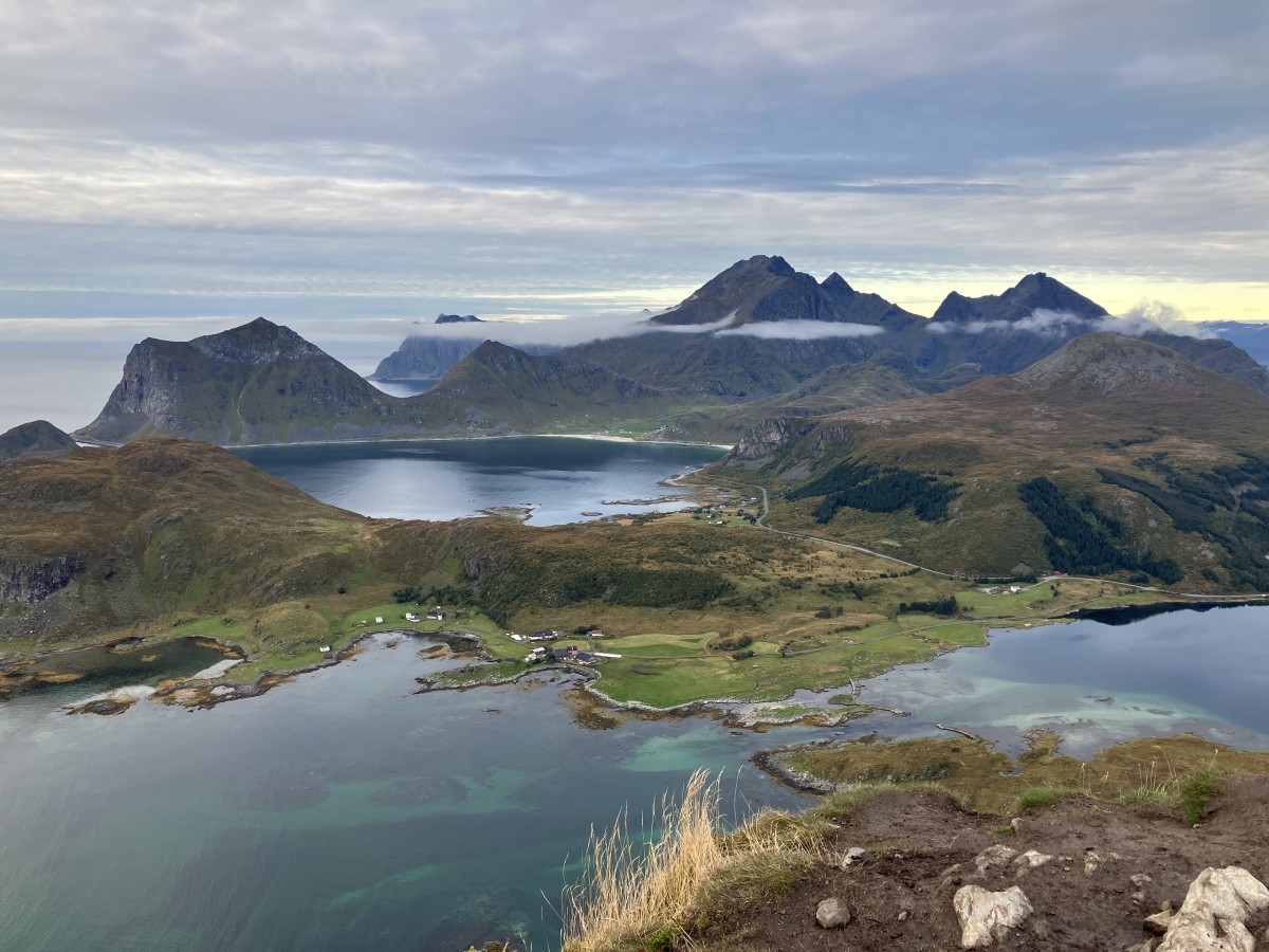 On voit au premier plan la baie Sversvika vers laquelle nous descendrons par la suite, au fond la baie de Haukland et Vik où nous étions quelques jours plus tôt.