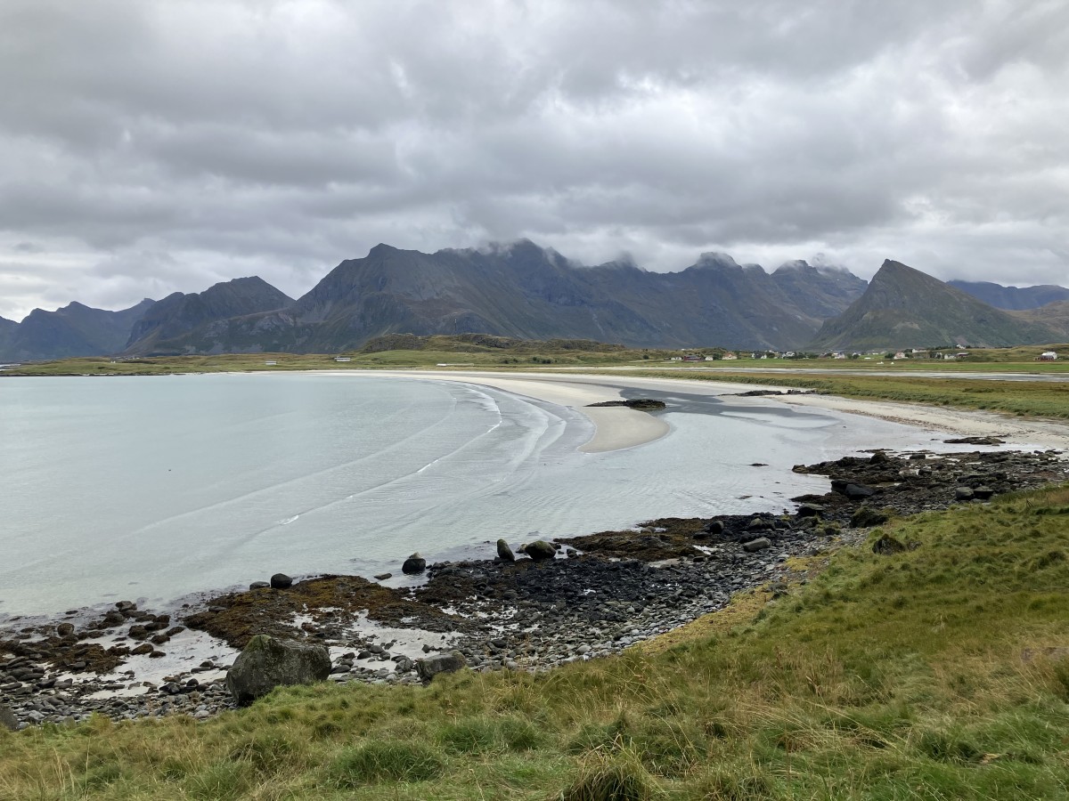 Après hier, cette journée du 11 septembre 2022 est encore très humide et sans doute la seule où nous partons sous la pluie sans qu’elle ne s’arrête. Pour l’occasion, on choisit un tour très court entre Yttersand et le cap Mulstøa sur l’île Moskenesøya. Il faut à peine 4,5 kilomètres pour l’aller-retour. Il y a peu de dénivelé et on ne peut de toute manière pas continuer au-delà du cap. La baie de départ est connue pour ses grandes plages de sable fin et clair. La plupart de noms de lieu contiennent le terme « Sand » qui signifie « sable » comme Sandbotnen, Yttersand, Innersand, Sandøya. On trouve aussi le nom « plage »: Strandveien.