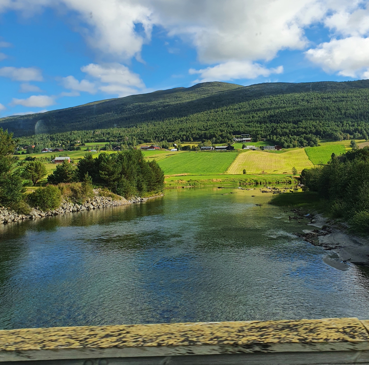Nous partons de Hamar vers 14 heures ce 29 août 2022. Il nous reste de la route vers le nord. Le temps reste radieux, on longe des lacs et on change les rives sur des grands ponts. Depuis Hamar, l’E6 n’est plus une autoroute, mais une voie rapide nouvellement adaptée. Il n’y a pas de circulation. On est certes le weekend, mais nous roulons à contre-courant de la circulation des derniers estivants. Les citadins partant dans la nature ne sont pas encore en route retour.