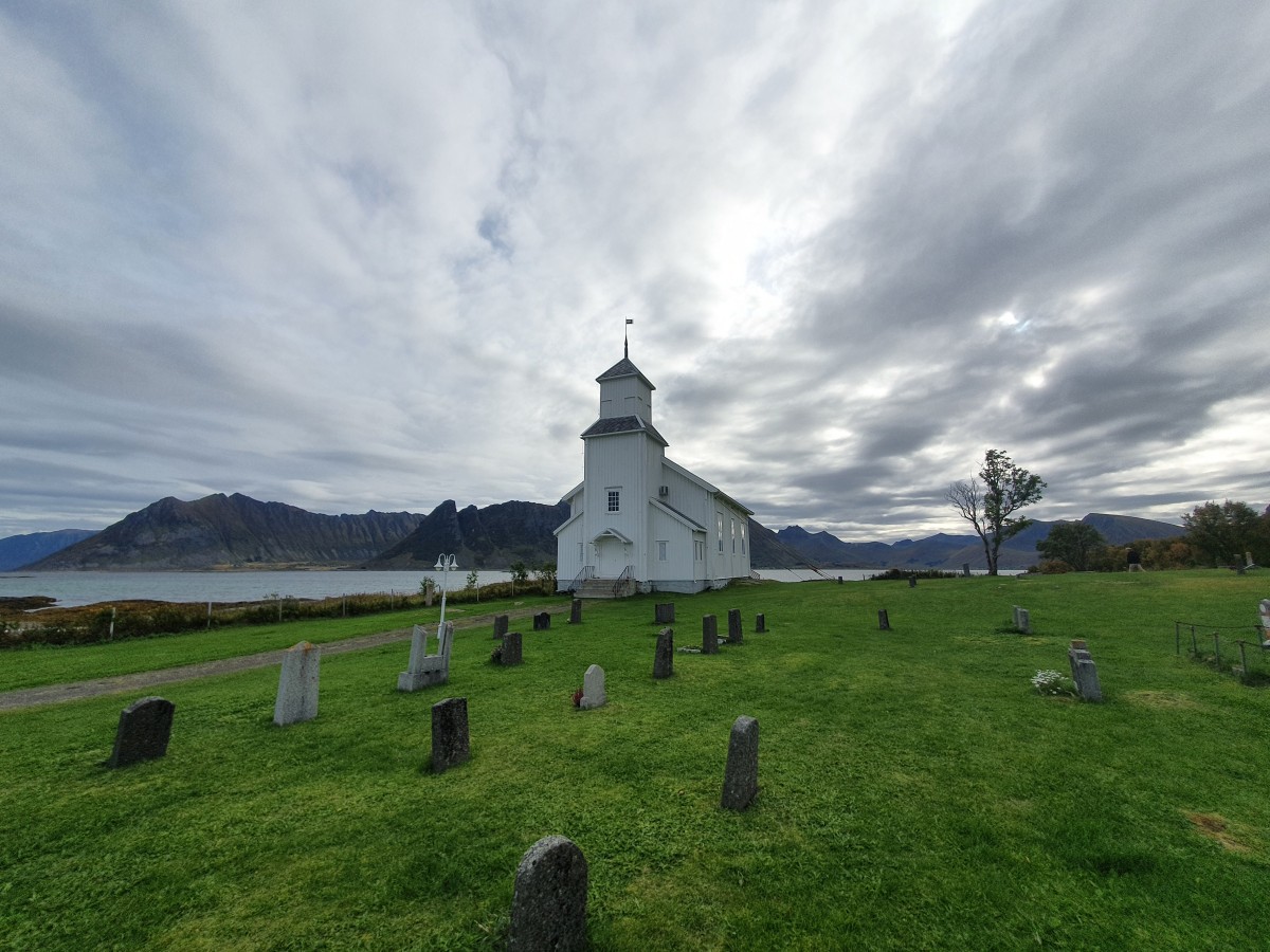 C’est une longue église en bois pouvant abriter 300 personnes et inaugurée en 1876. L’église de Gimsøy est mentionnée pour la première fois en 1432, et l’église d’aujourd’hui au moins la troisième de l’île.