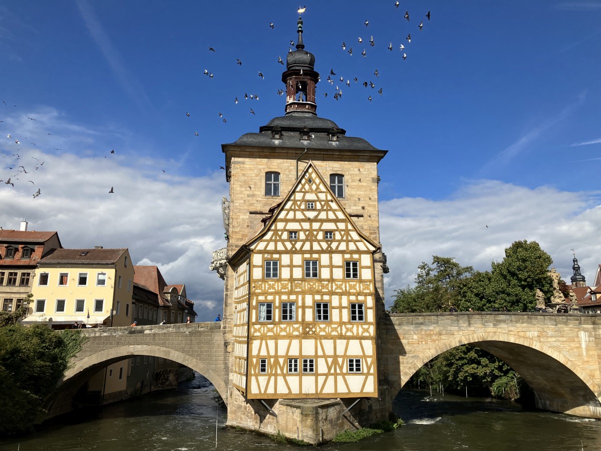 Après quatre semaines, voici le dernier volet de cet aller-retour du Tyrol aux Îles Lofoten. Nous venons de Lübeck et après avoir passé la nuit près de Magdebourg, nous faisons principalement des kilomètres vers le sud. Nous nous arrêtons cependant à Bamberg parce qu’Alex a pris goût aux visites sur les les trajets des vacances. Nous sommes le 26 septembre 2022, la météo est redevenue bonne ici au nord de la Bavière.
