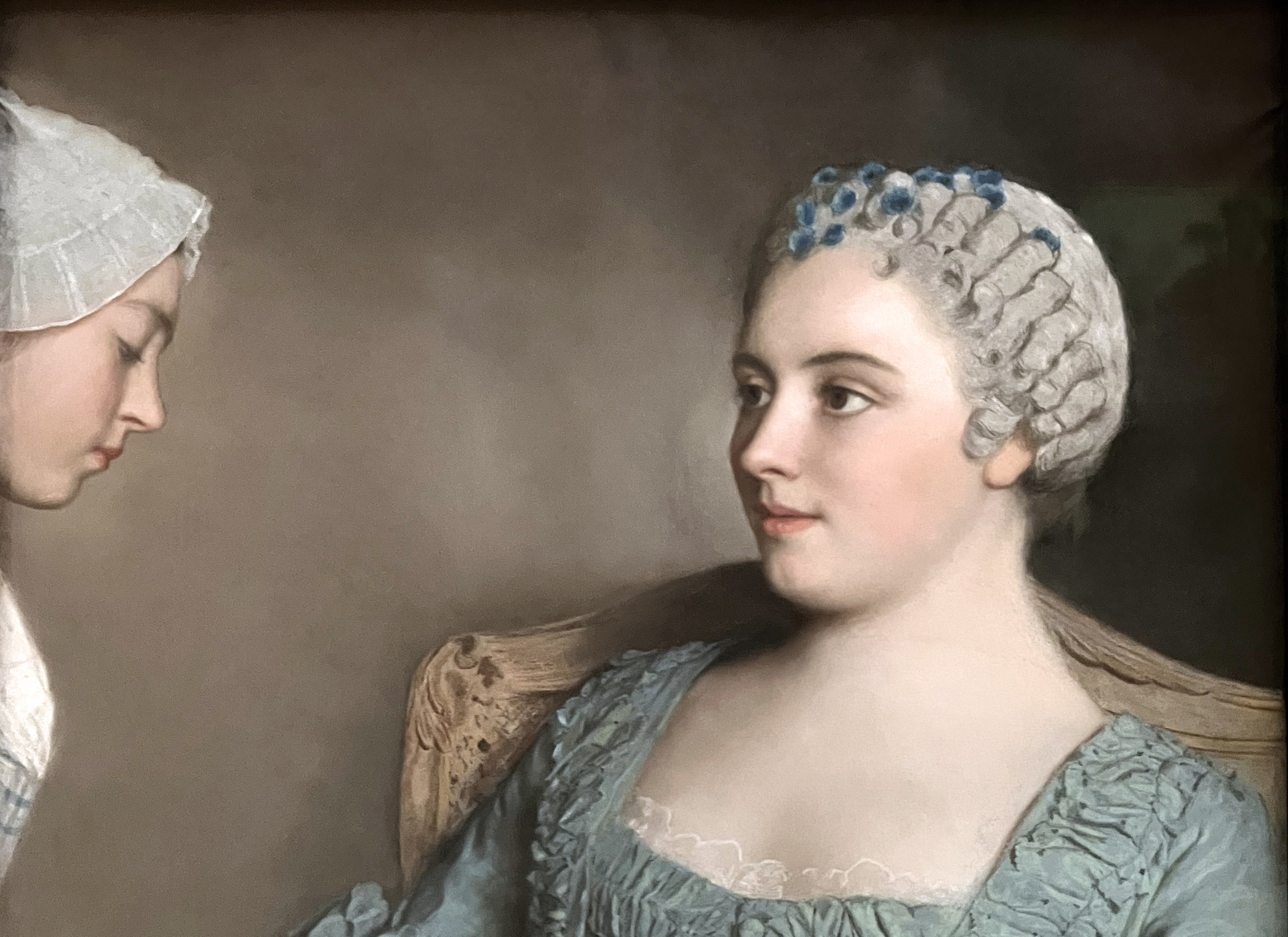 Le regard de la jeune femme sur sa servante peut être interprété de manières différentes. Juste encore endormie, lascive, jugeant, envieuse, de quoi?