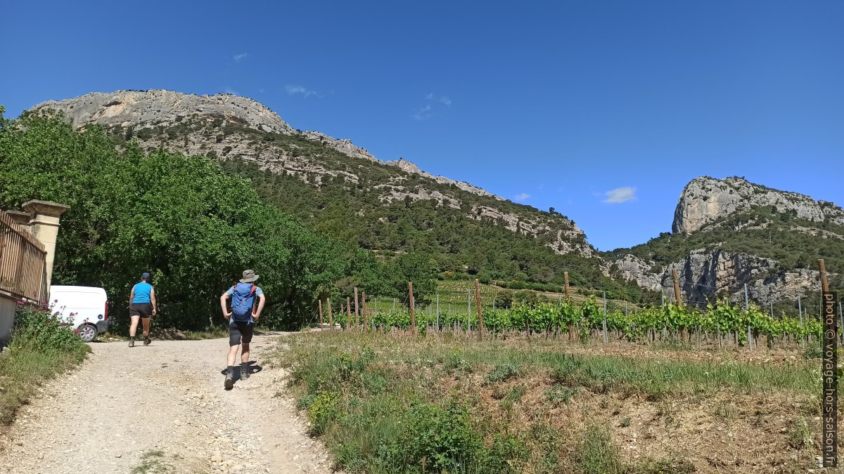 On laisse la voiture au parking au pied du petit village de Lafare. Il faut marcher un peu sur la route, mais on peut assez vite dévier à gauche parmi les vignes.