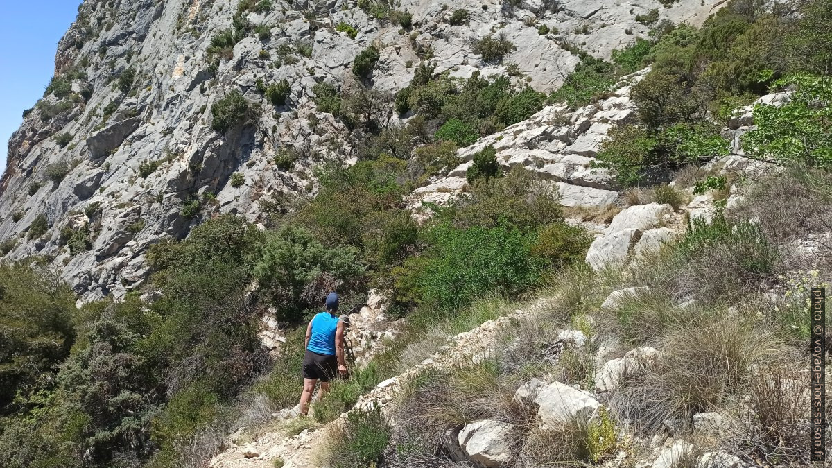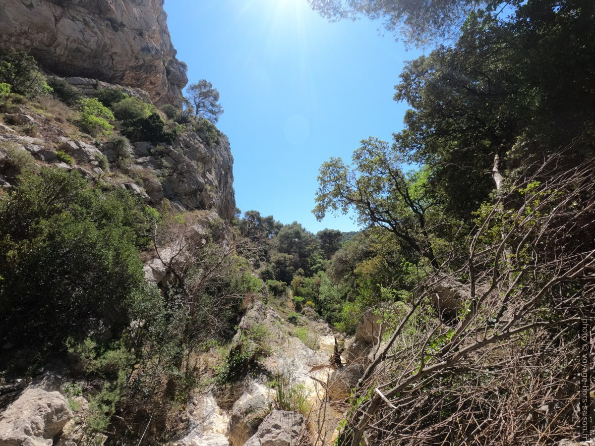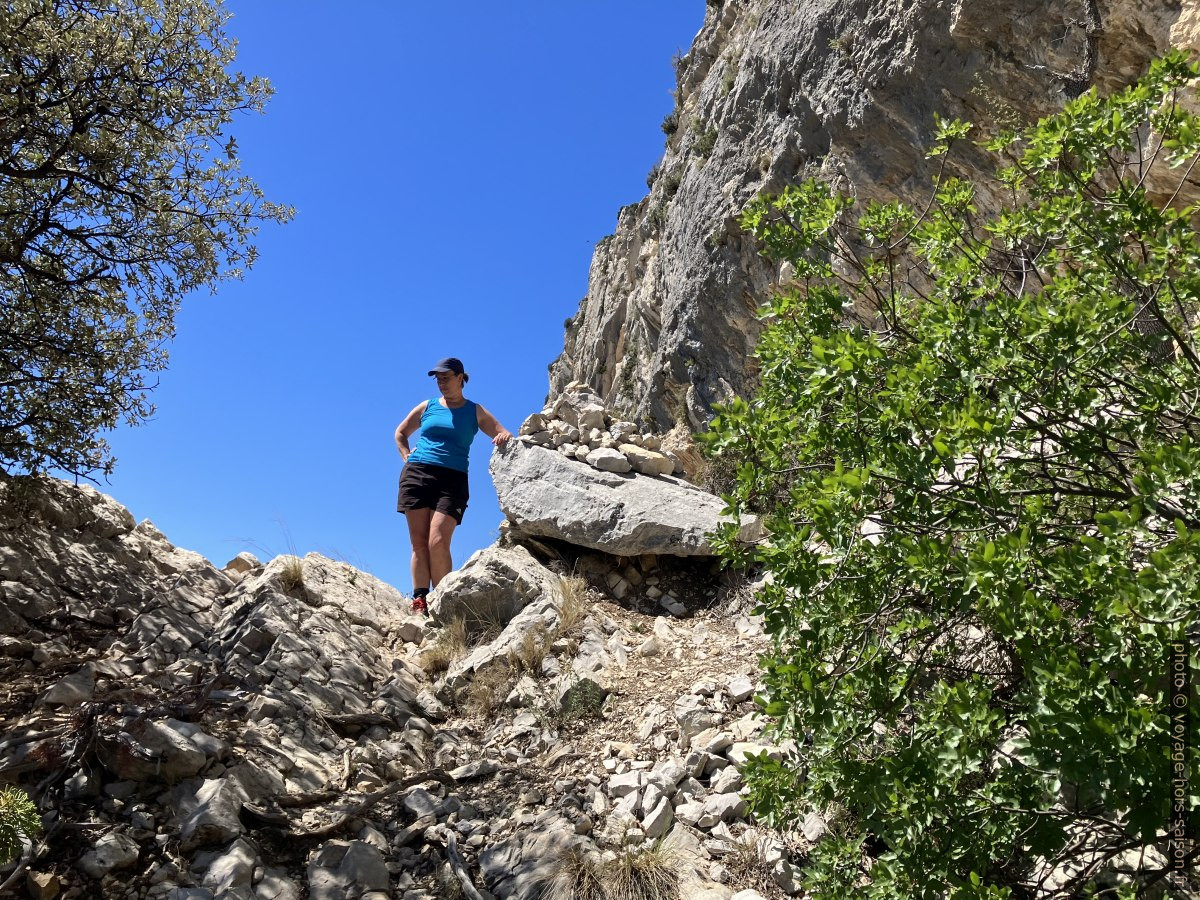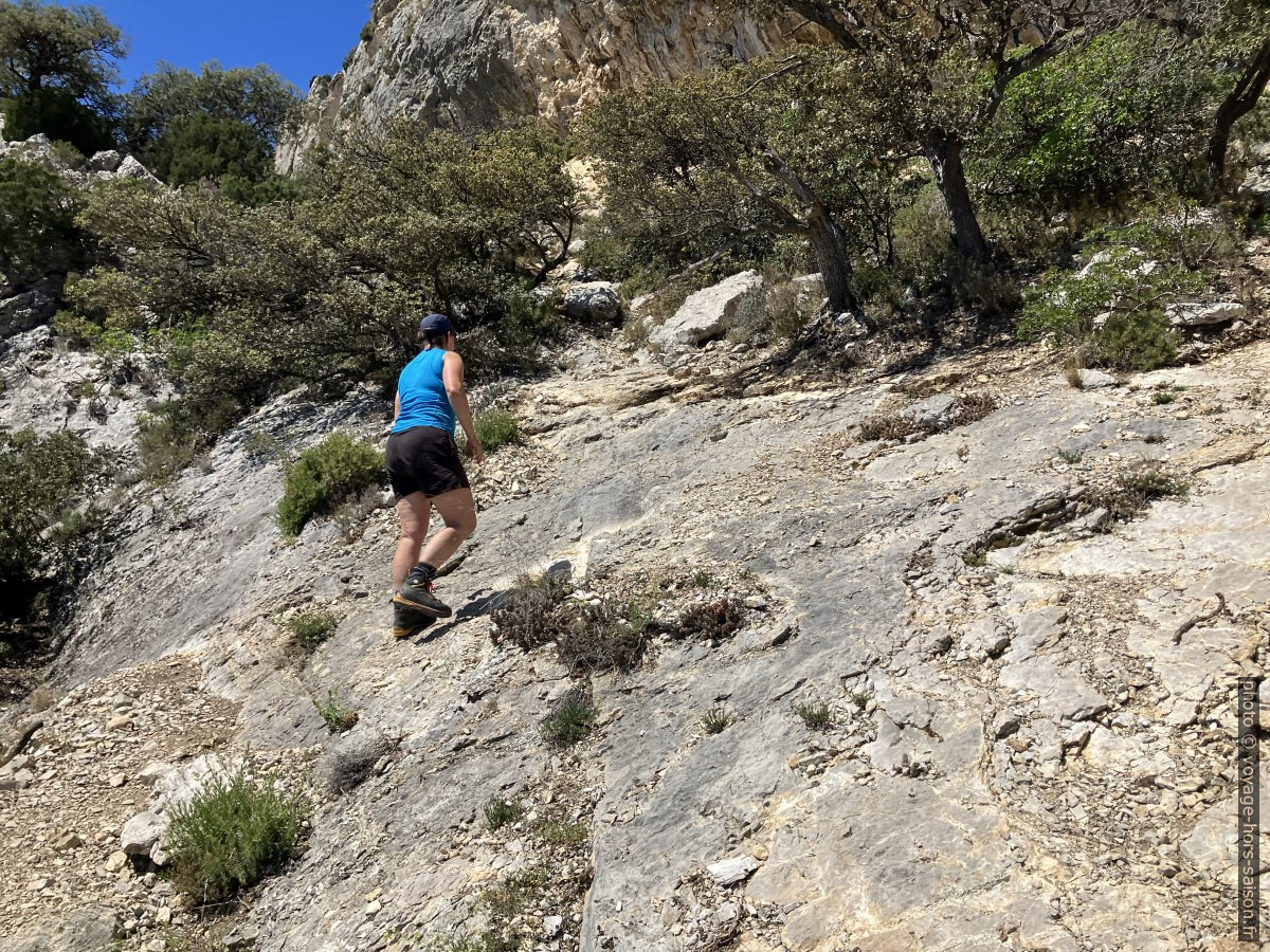Cette descente est rapide et principalement verticale. Pour finir, on marche dans le lit asséché du Vallat de l’Aiguille. Cela a du charme, mais c’est fatiguant. Il y a aussi un chemin sur la gauche pour ceux qui sont pressés, mais nous on aime les cours d’eau, même s’ils sont à sec comme ici.