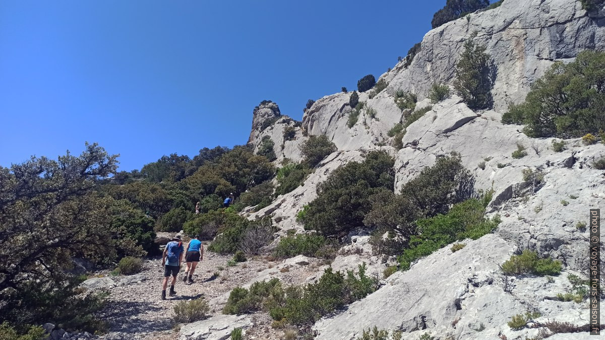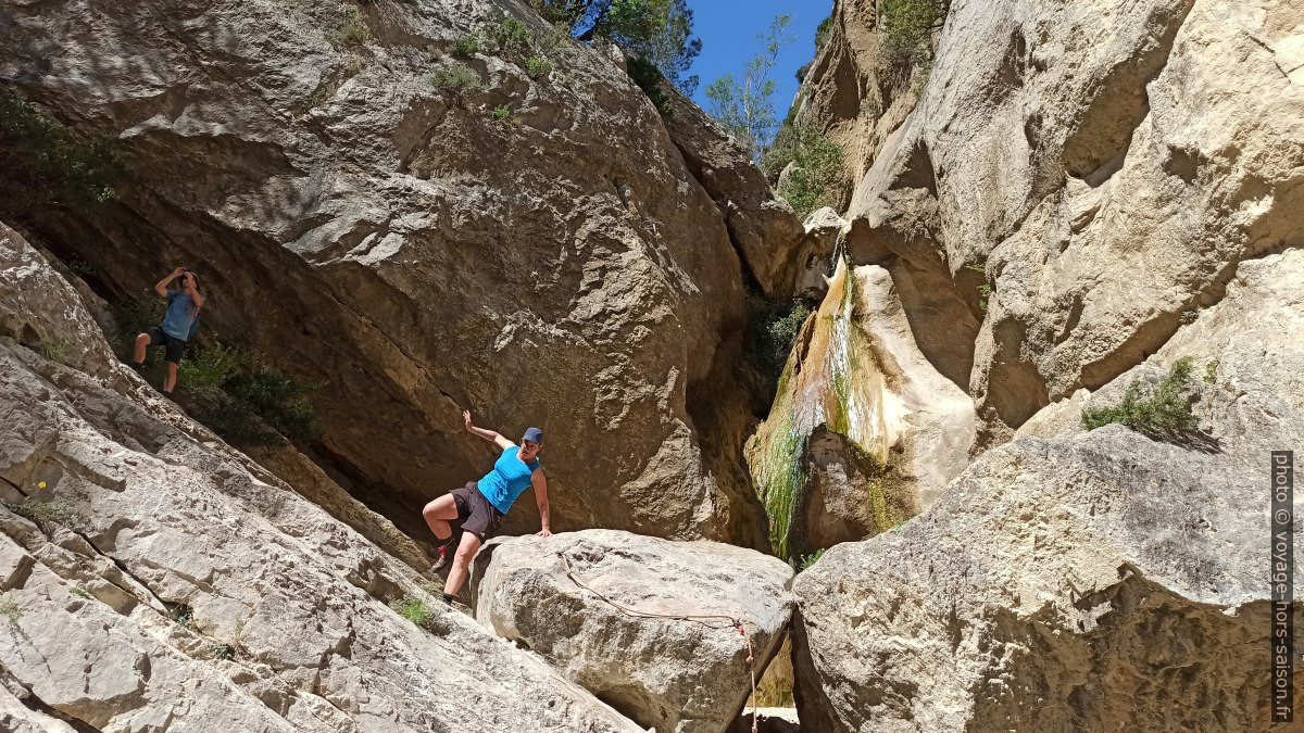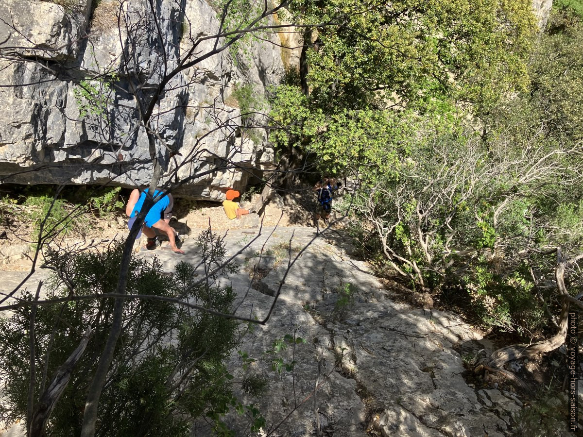 La ballade le long du Vallat du Fenouillet est en tout cas plaisante car très diverse. Nous entendons des voix, nous ne sommes pas les seuls ici. Il y a aussi des grimpeurs haut dans les parois rocheuses.