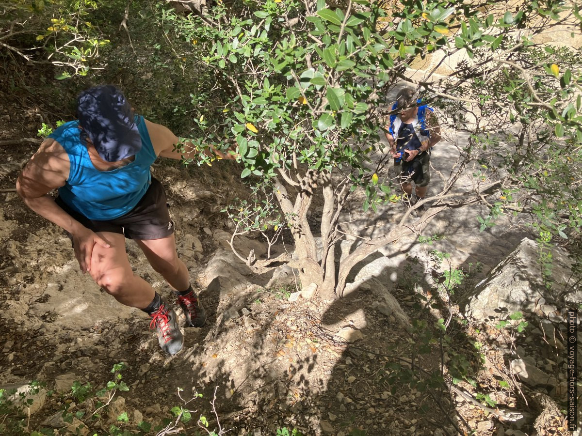 C’est un couloir sans trop de prises, mais la roche est rugueuse. Il faut avoir confiance en l’adhérence de la gomme de ses chaussures. C’est encore Alex qui passe devant. André peine massivement car il sait qu’il faudra y redescendre et c’est toujours plus pénible surtout qu’il n’y a que quelques ronces plus bas. Notre ami suivra aussi.