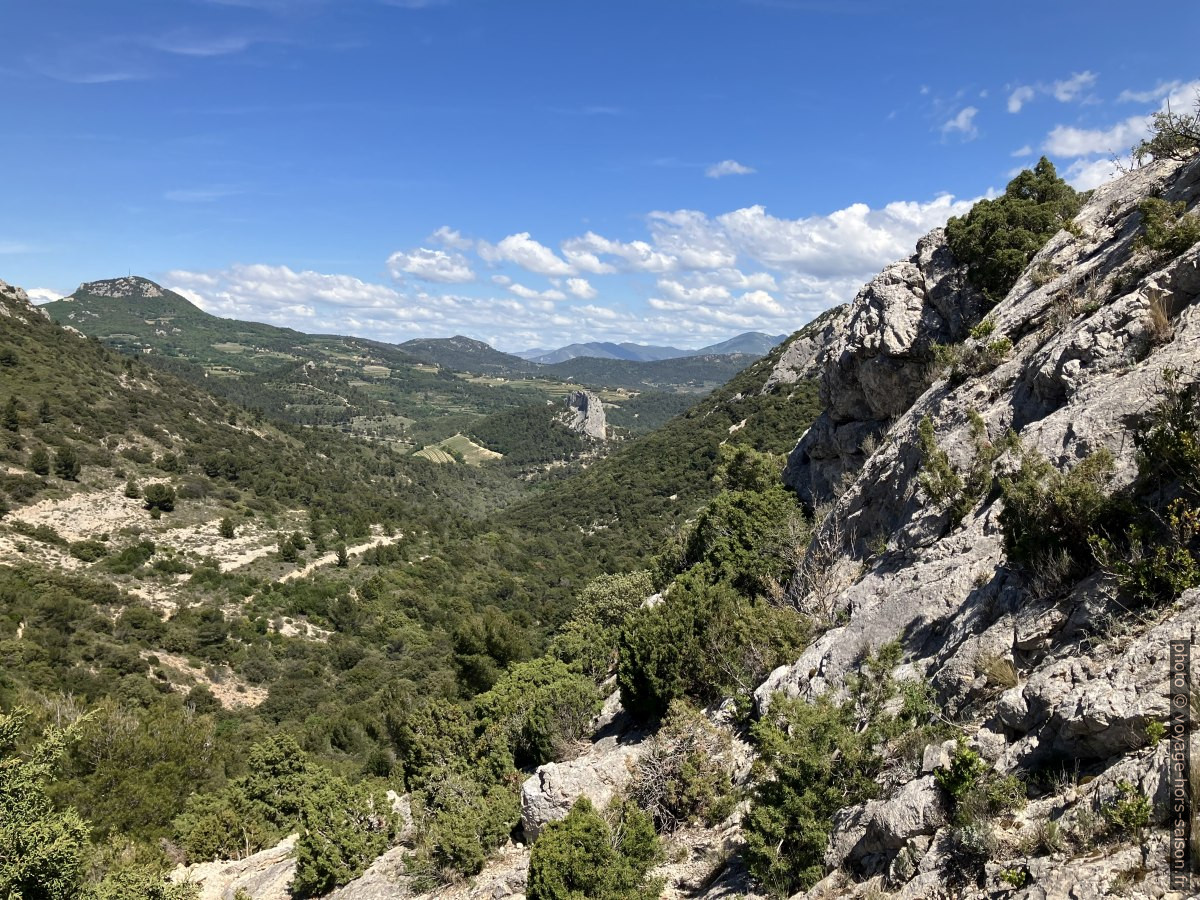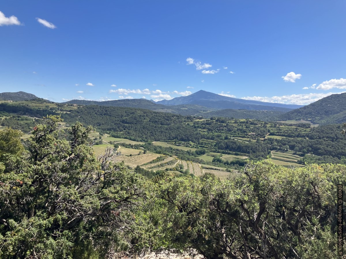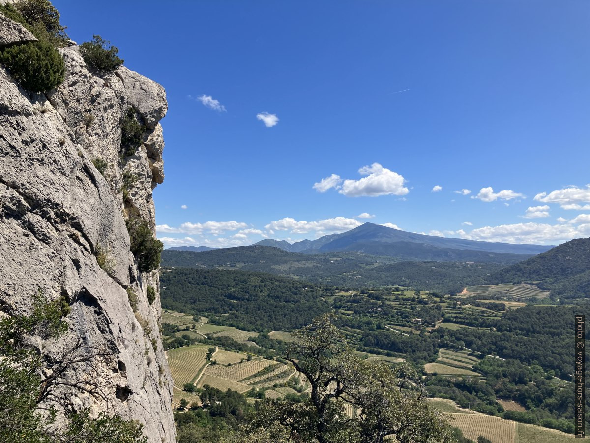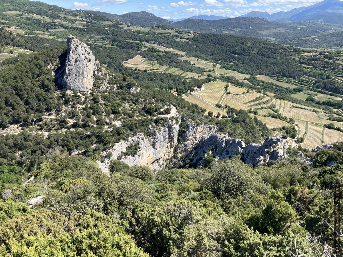 Finalement la vue n’est pas si mauvaise, même si on s’attendait à ce que ce soit vertigineux du côté nord. La vue sur les Dentelles Sarrasines est bonne, mais on en aura d’autres. Elles ont l’air petites, mais cela trompe. Il ne serait pas possible de les inclure aisément dans ce tour.