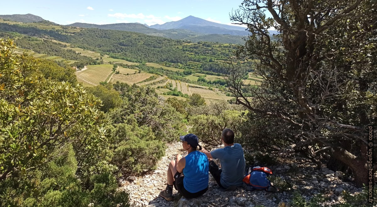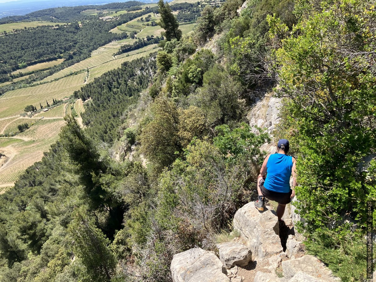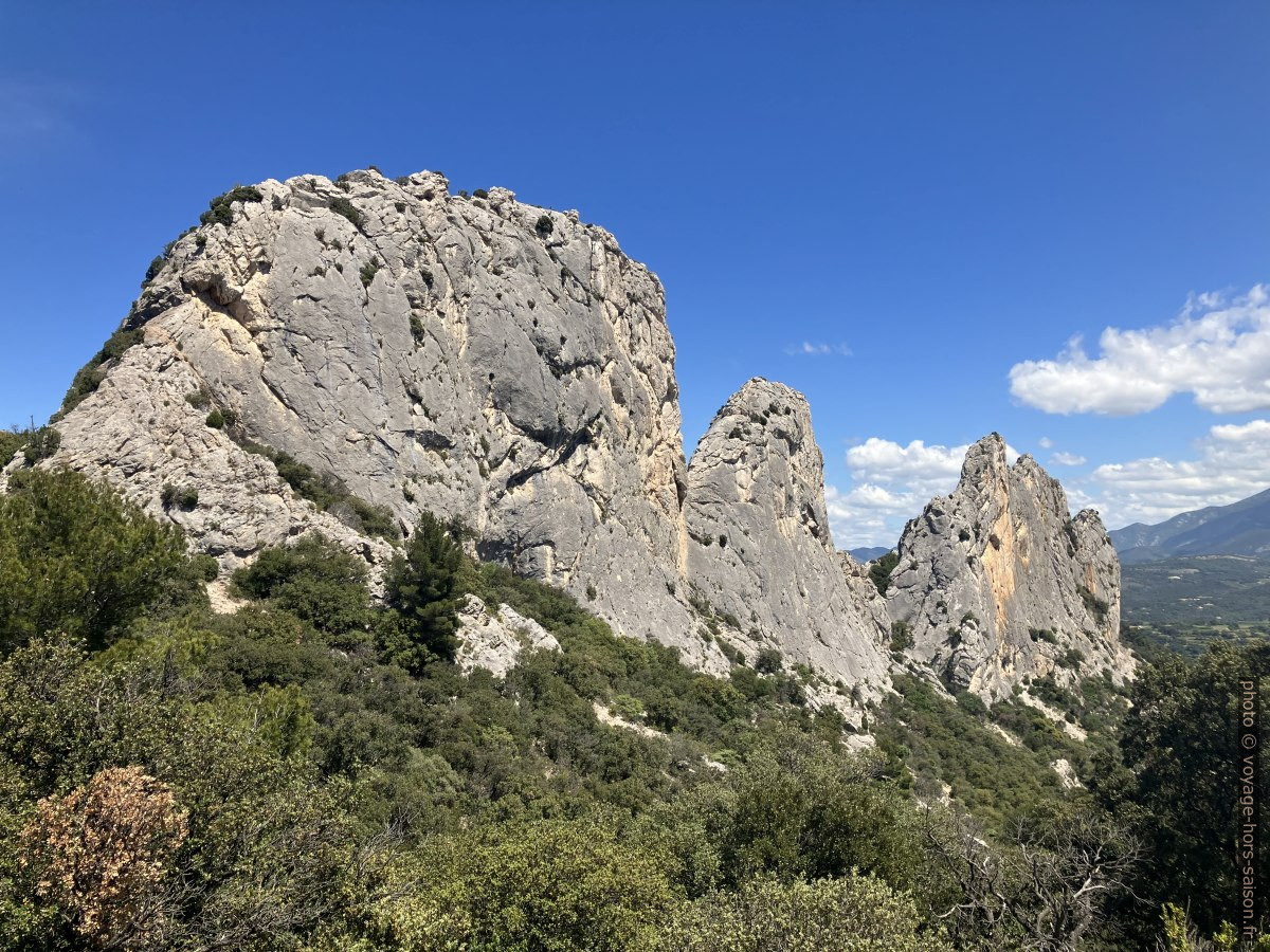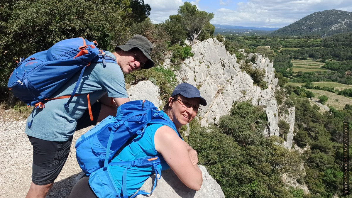Finalement la vue n’est pas si mauvaise, même si on s’attendait à ce que ce soit vertigineux du côté nord. La vue sur les Dentelles Sarrasines est bonne, mais on en aura d’autres. Elles ont l’air petites, mais cela trompe. Il ne serait pas possible de les inclure aisément dans ce tour.