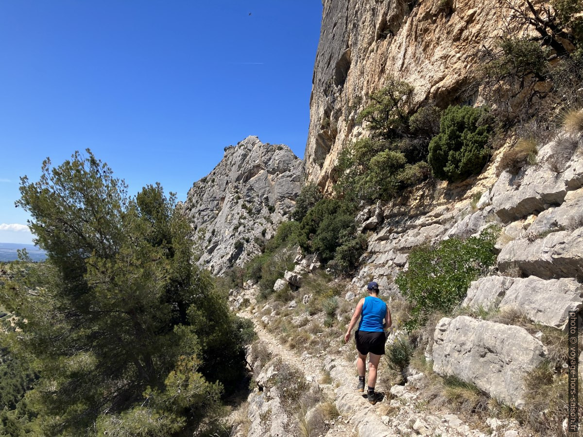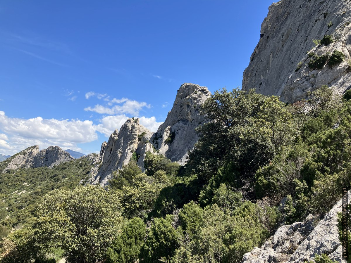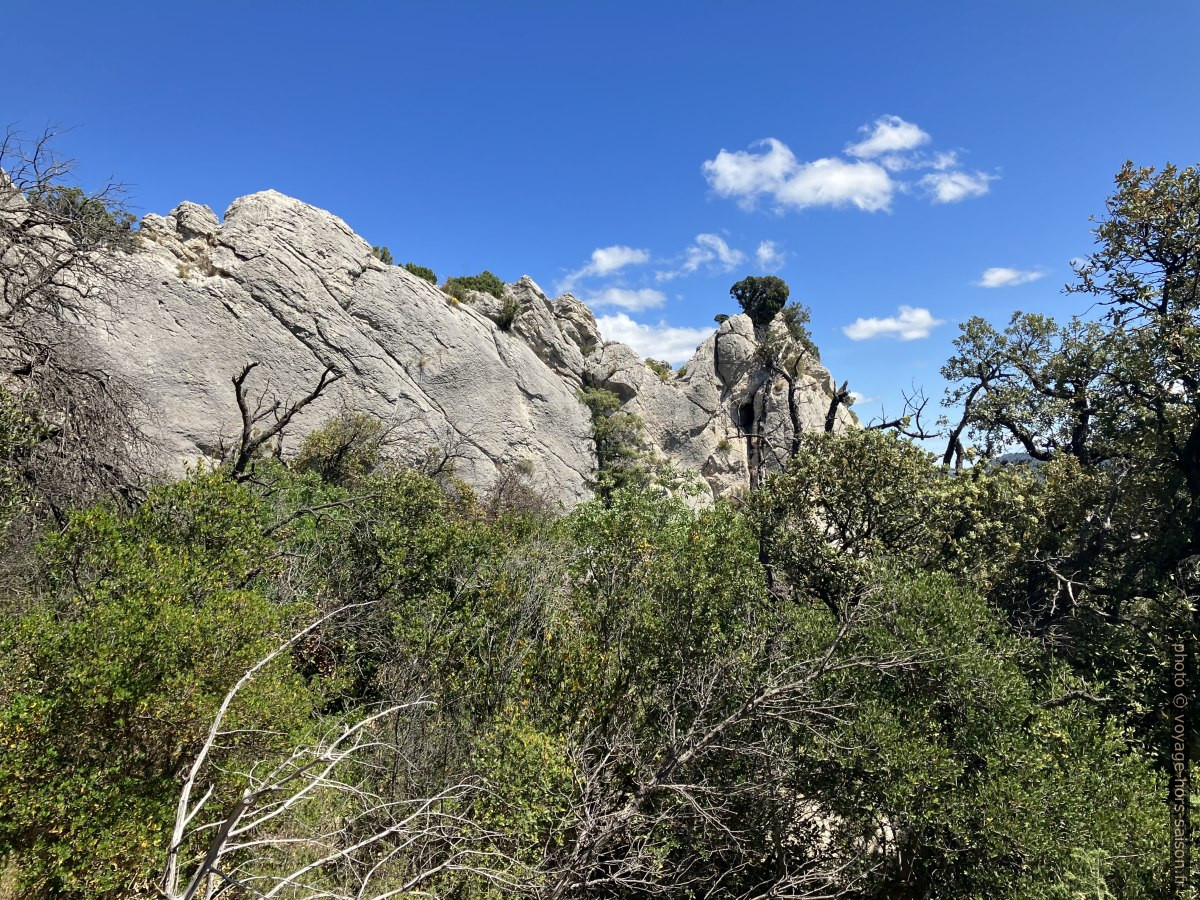 Ces crêtes rocheuses calcaires petites mais impressionnantes étaient longtemps sur notre liste des choses à faire. En 2012, nous y étions déjà, mais nous ne pouvions alors pas compléter le tout que nous faisons aujourd’hui. Pour ne pas nous donner des fausses idées, nous commençons par le passage le plus difficile. C’est la montée du bas du Vallat de Fenouillet à la Falaise de la Salle. Ce tour est décrit en détail sous La Crête de la Salle dans les Dentelles de Montmirail.