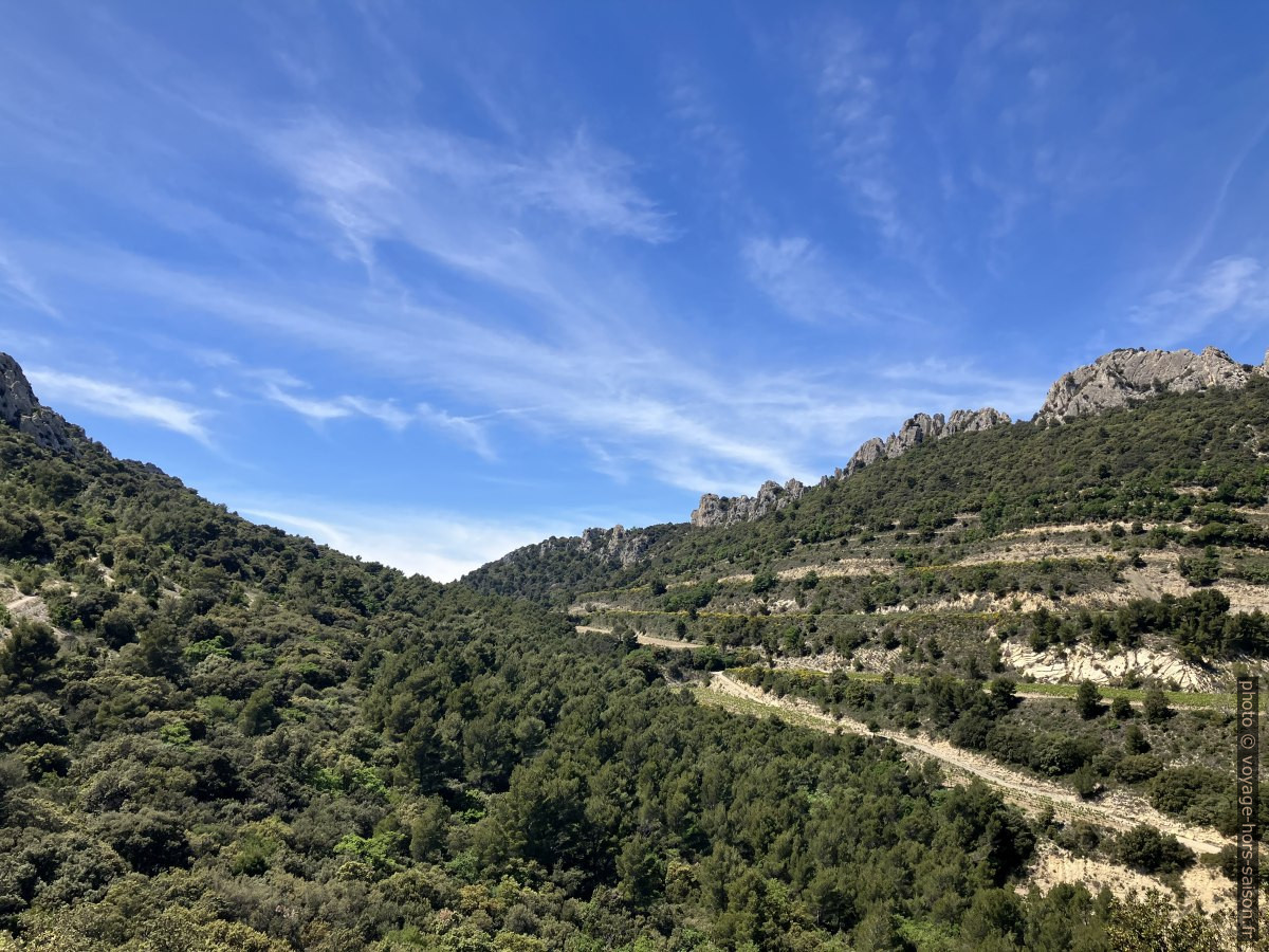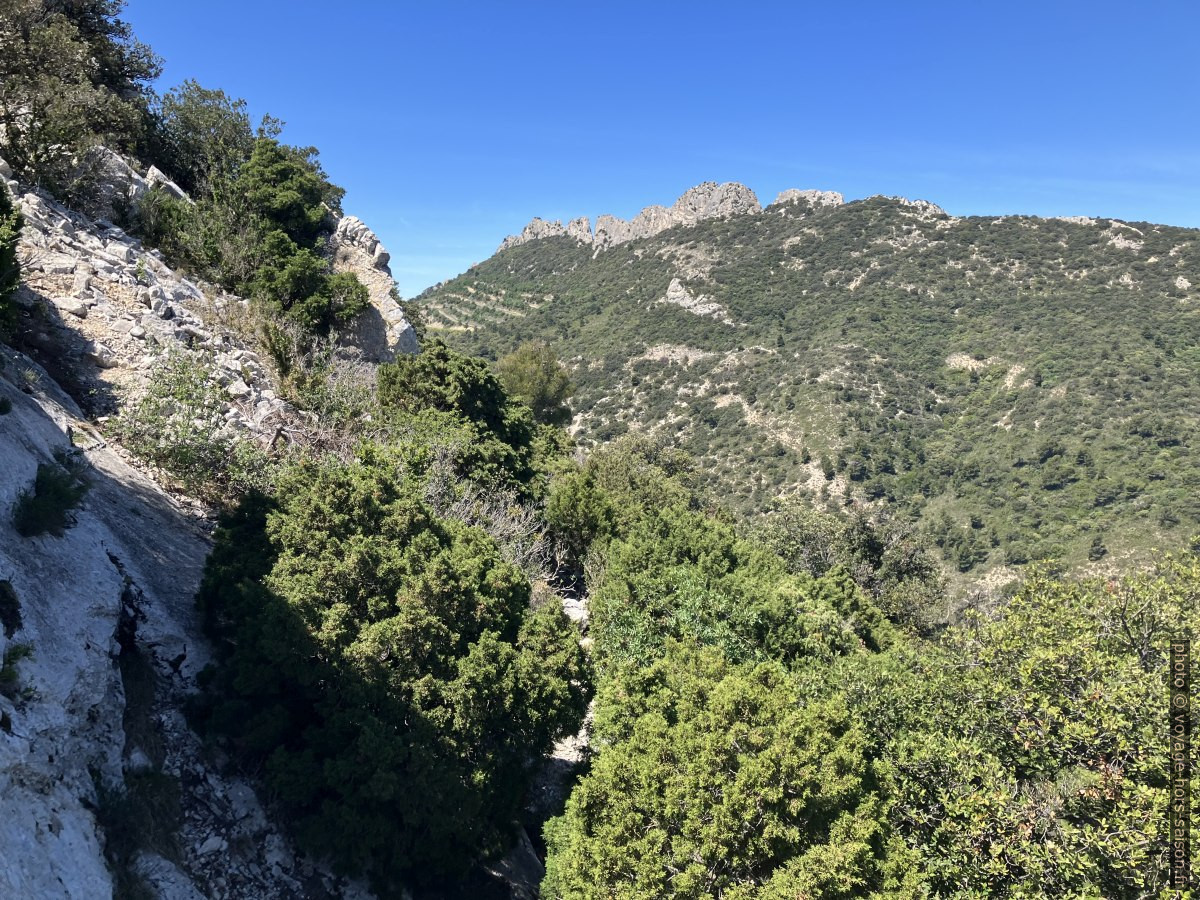 La vue retour vers le Col d’Alsau que nous n’avons pas atteint. Il forme le point culminant entre les deux crêtes des Dentelles de Montmirail.