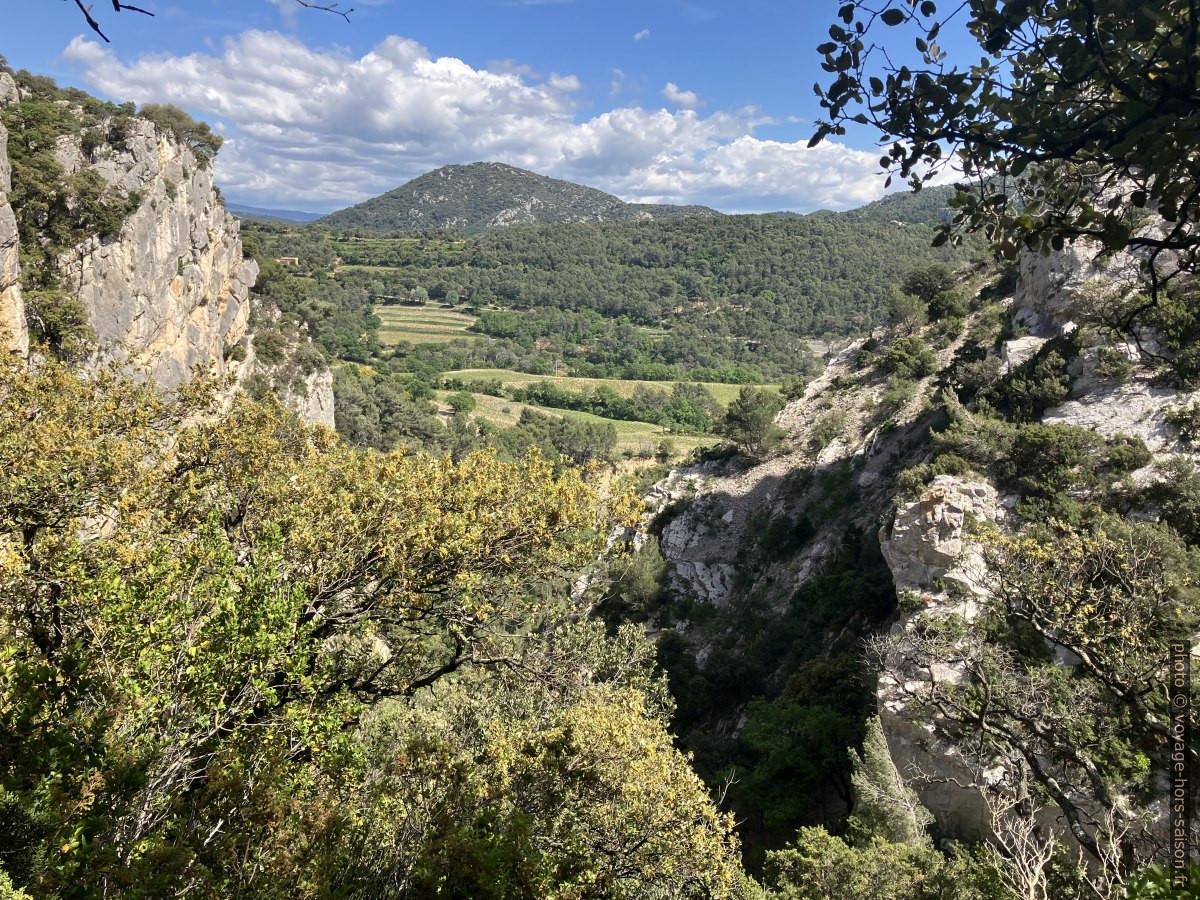 Nous retombons ensuite sur le Chemin des Dentelles qui m’est autre que le cul-de-sac de  la route au-delà de la Fare. On y trouve quelques belvédères dans les gorges du Vallat de Fenouillet.