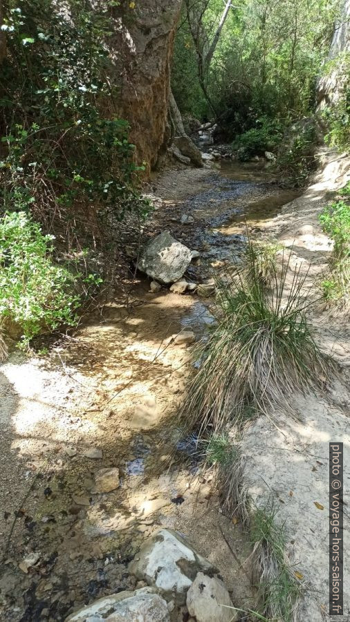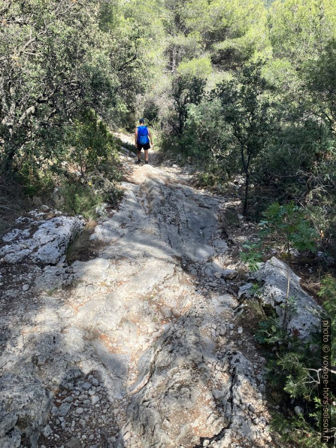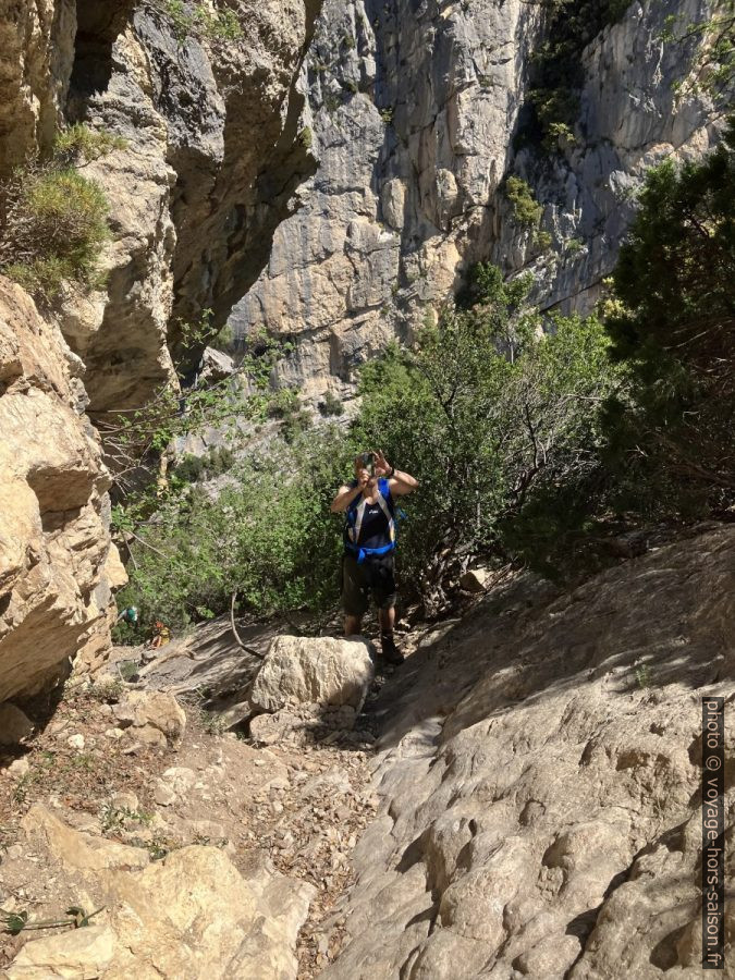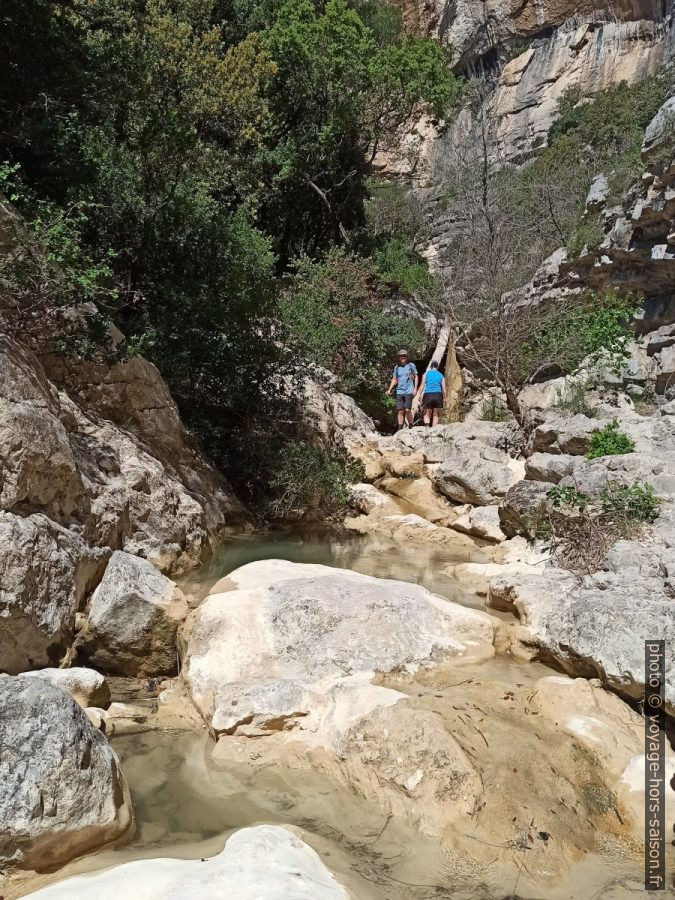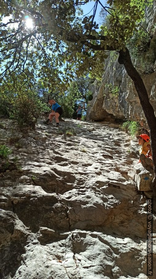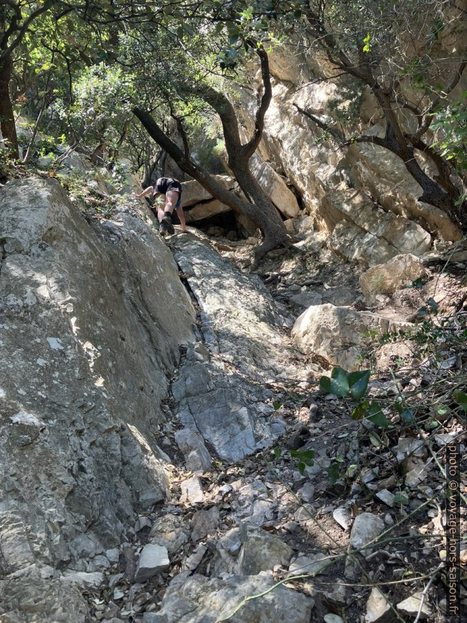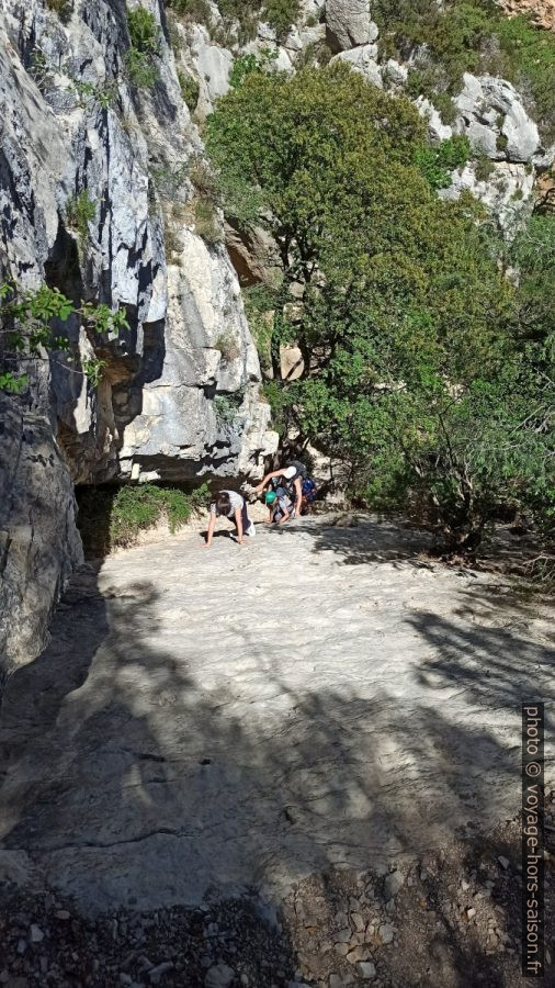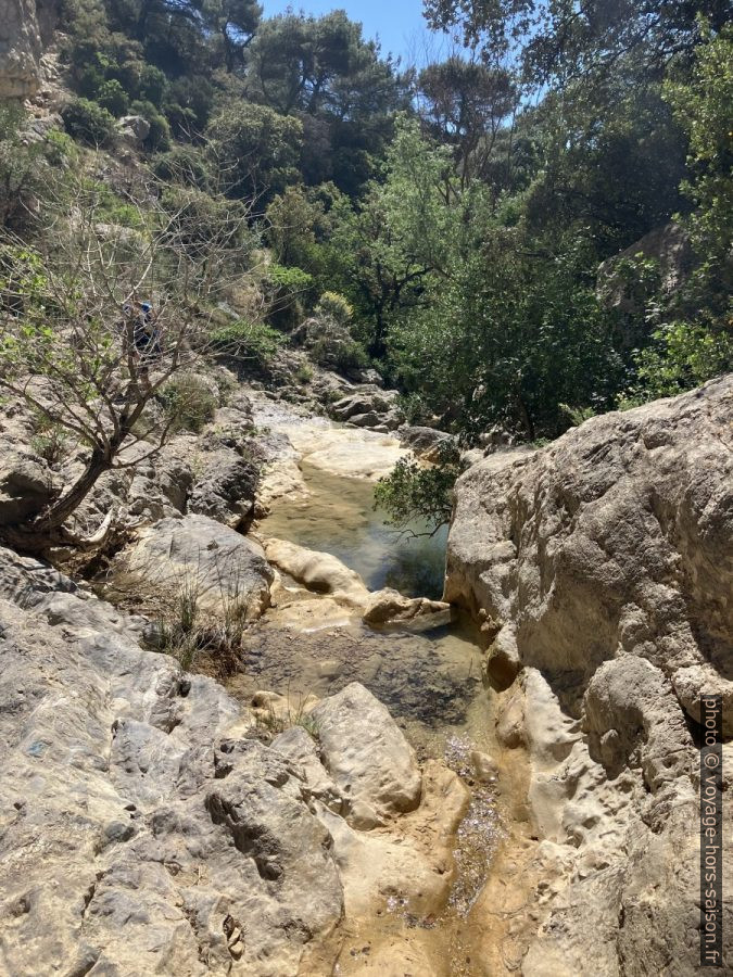 Cette descente est rapide et principalement verticale. Pour finir, on marche dans le lit asséché du Vallat de l’Aiguille. Cela a du charme, mais c’est fatiguant. Il y a aussi un chemin sur la gauche pour ceux qui sont pressés, mais nous on aime les cours d’eau, même s’ils sont à sec comme ici.