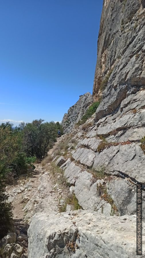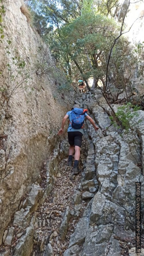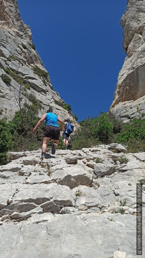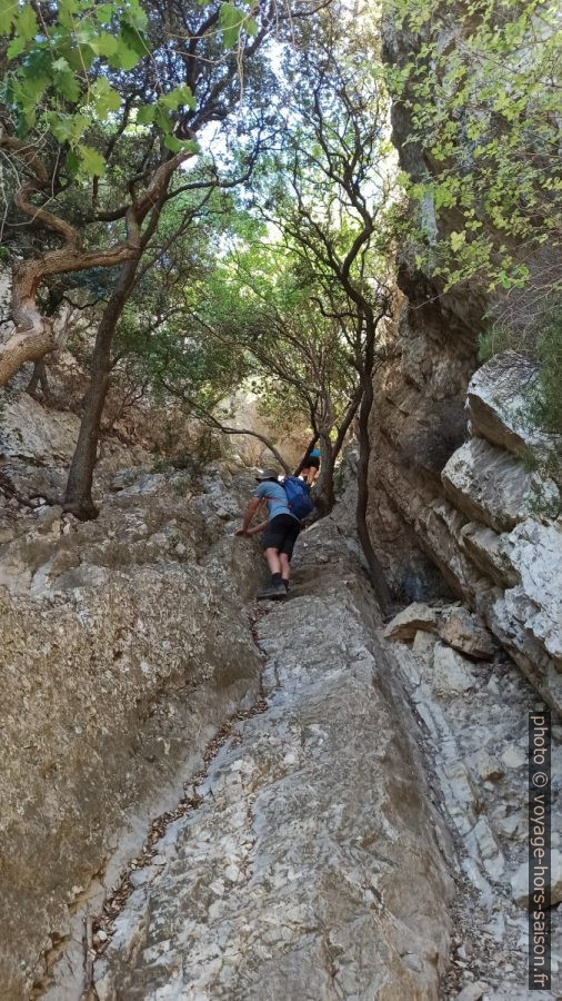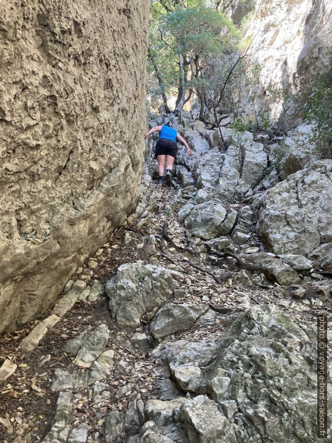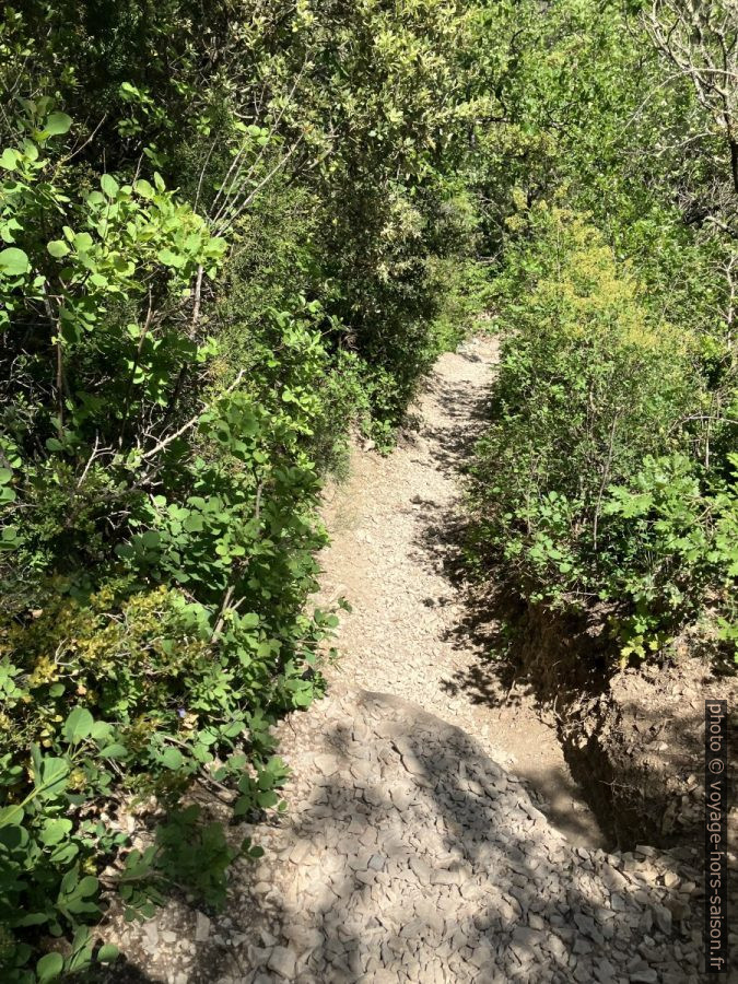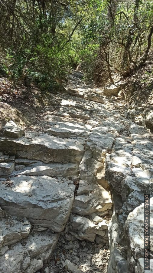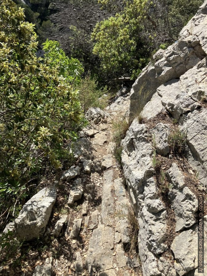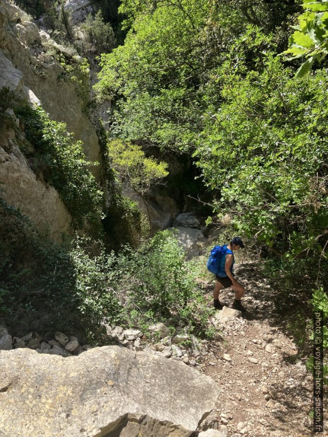 Cette descente est rapide et principalement verticale. Pour finir, on marche dans le lit asséché du Vallat de l’Aiguille. Cela a du charme, mais c’est fatiguant. Il y a aussi un chemin sur la gauche pour ceux qui sont pressés, mais nous on aime les cours d’eau, même s’ils sont à sec comme ici.