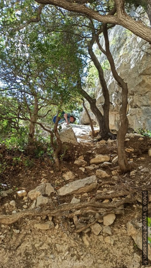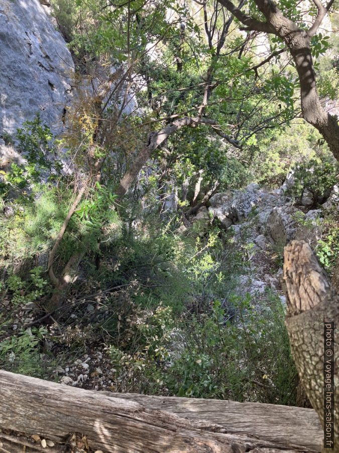 Nous montons d’une dizaine de mètres et les balises indiquent alors de passer à gauche. Or le vallon est à gauche. Une sente descend ici aussi. C’est une pente forte et on voit même des marches aménagés. On voit aussi des grimpeurs qui s’exercent ici. Ce chemin continue en descente. Puis il s’arrête à la hauteur de deux troncs de chênes posés en travers. On pourrait continuer sur une vingtaine de mètres, mais nous avions vu la situation en bas. La cascade basse était encaissé contre la falaise sans laisser aucun passage. Et c’est cette même paroi que nous avons ici sur notre gauche. Cela ne peut se terminer que par un cul-de-sac. Dans le meilleur des cas, il y a une sortie vers le haut de la cascade basse, mais cela ne nous avancerait pas.