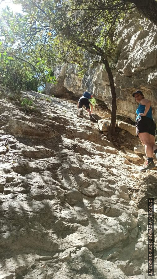 Sur les deux photos ci-bas, André est déjà monté un peu sur le plan incliné. La pente dépasse en tout cas 45°. On y tient, mais c’est du calcaire très dense rendu lisse par les passages. Il est surprenant que tant de gens passent ici car ce n’est vraiment pas facile.