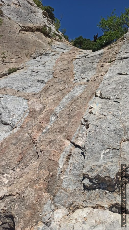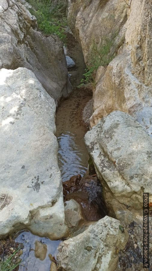 À partir de la route au nord de Lafare, il faut s’engager directement dans les gorges creusées par le Vallat de Fenouillet. Il y a quelques balises bleues qui aident à trouver les meilleurs passages, mais il n’y a définitivement pas de chemin. On marche dans le lot de la rivière et c’est un terrain très rocheux. Les concrétions calcaires au font du lit couvrent les rochers et forment une sorte de couverture. Celle-ci est par nature assez rugueuse et c’est ce qui aide principalement ici pour avancer.