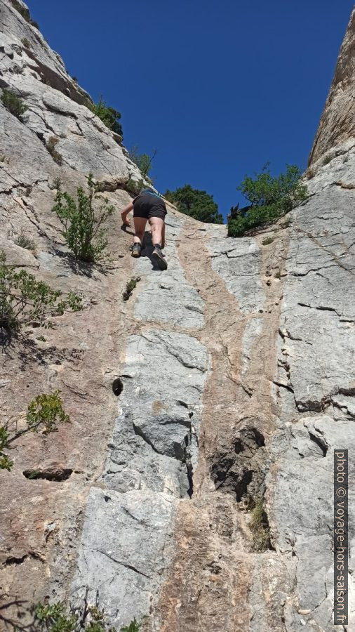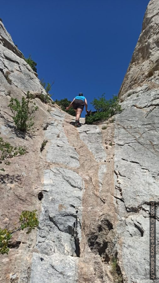 C’est un couloir sans trop de prises, mais la roche est rugueuse. Il faut avoir confiance en l’adhérence de la gomme de ses chaussures. C’est encore Alex qui passe devant. André peine massivement car il sait qu’il faudra y redescendre et c’est toujours plus pénible surtout qu’il n’y a que quelques ronces plus bas. Notre ami suivra aussi.