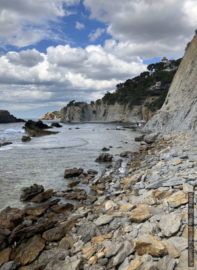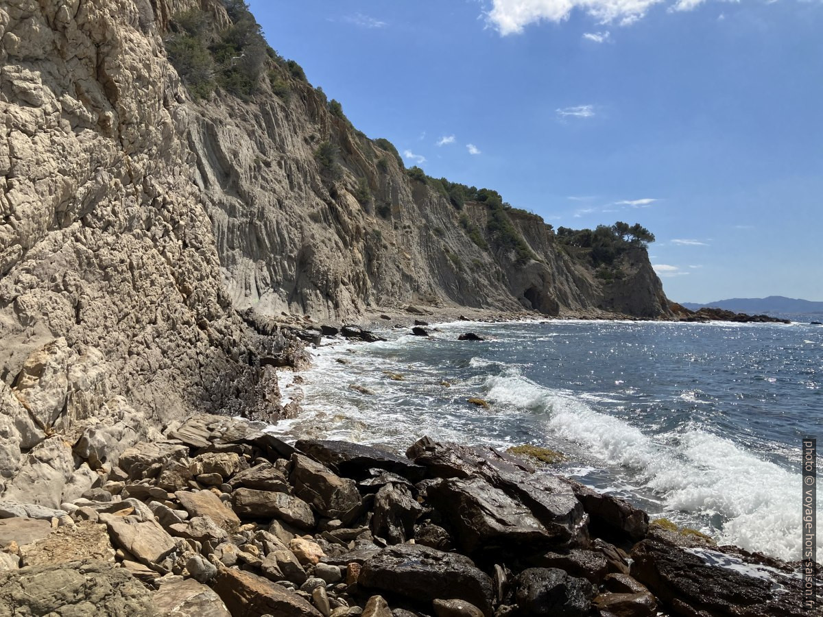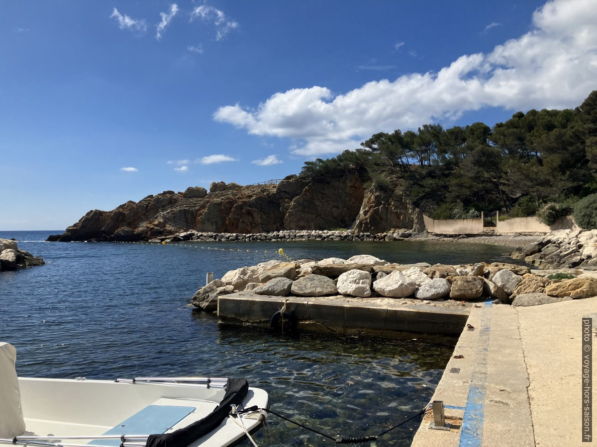 Une vue retour sur cette entrée naturellement protégé du Port de Figuières. Les strates verticales laissent passer les bateaux.