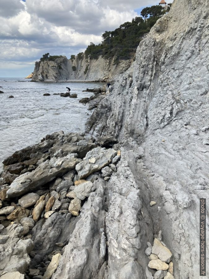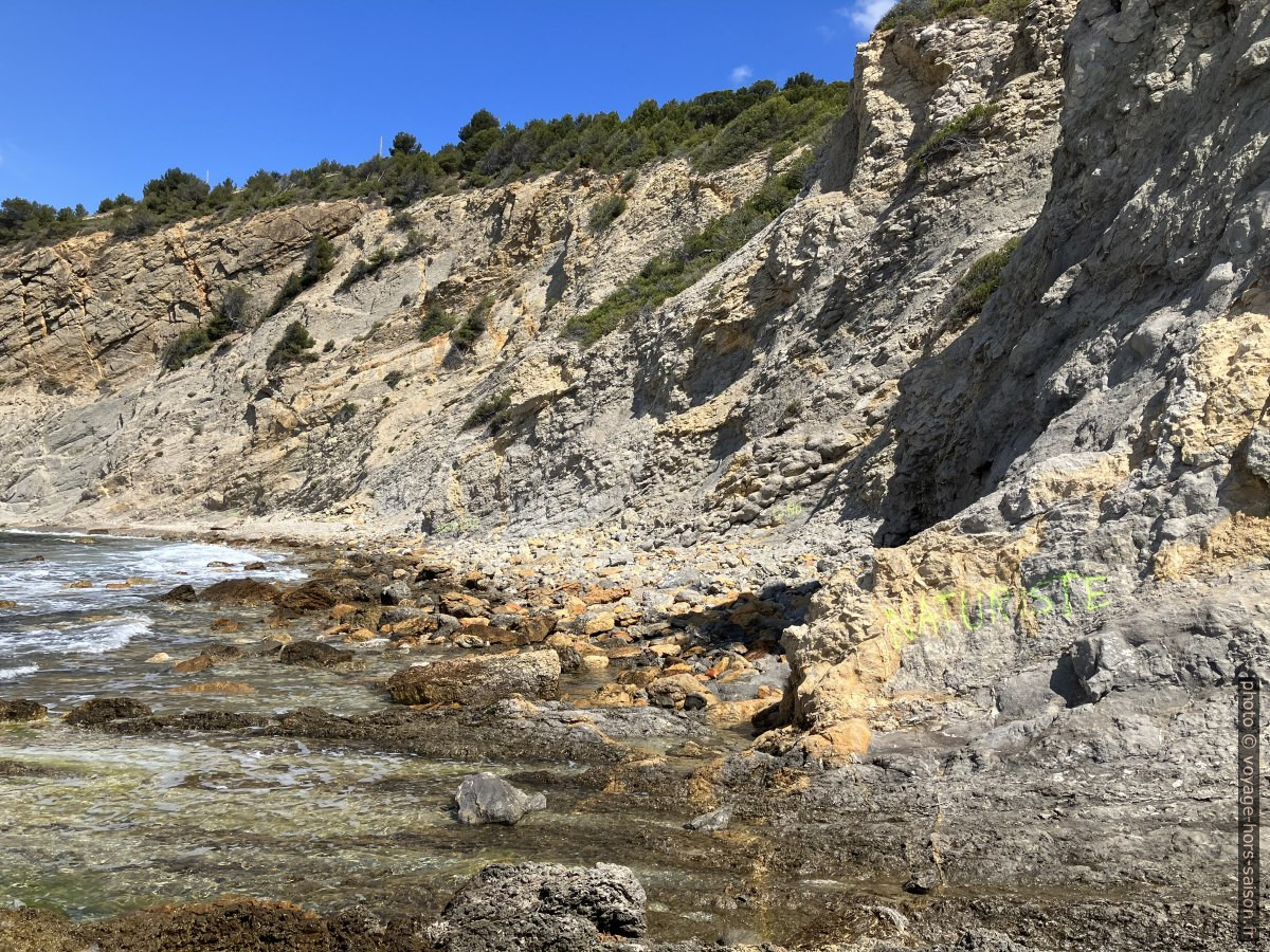 Dans la partie est de l’anse, on reconnaît très vite l’état d’erosion avancée. Les states sont ici très cassantes et l’humidité permanente travaille la roche. Ici, ça va encore, on voit la roche-mère dans l’eau, les débris fraîchement tombés ne couvrent pas encore tout. La marque en néon jaune indique « Naturiste ». Il est pourtant difficile de s’allonger ici et tout autant de rejoindre l’eau.