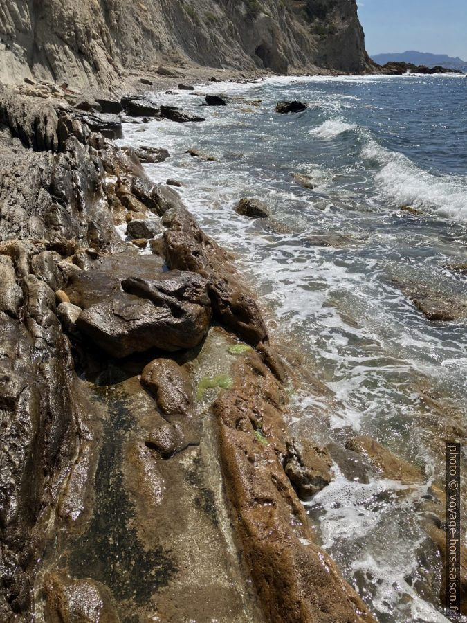 On voit déjà devant dans la calanque où nous pourrons quitter cette partie de côte érodée.