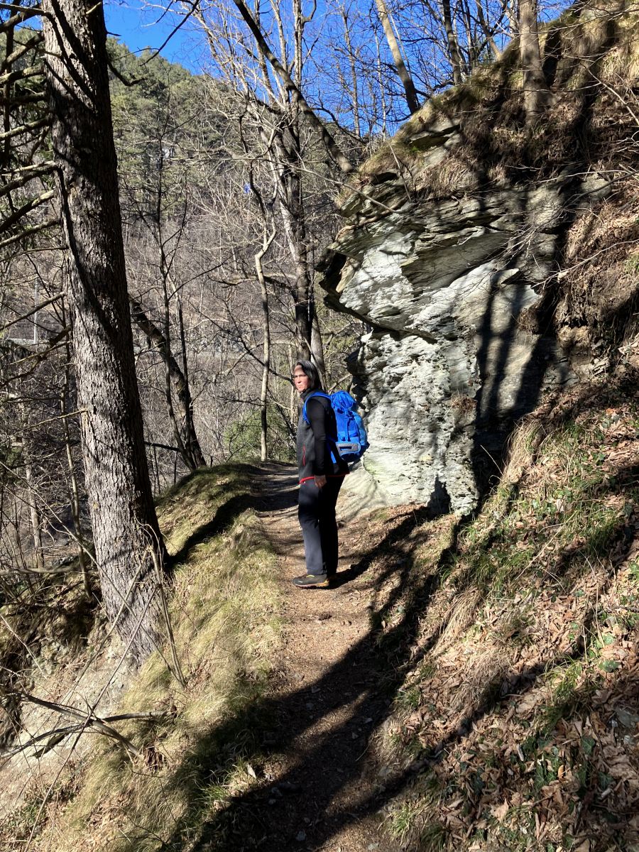 Le 12 février 2023, il fait de nouveau très beau. Nous sommes dans les gorges de la Sill, appelées Sillschlucht. C’est une vallée encaissée au sud de la capitale Innsbruck. Par cette vallée passe aussi le train et l’autouroute vers l’Italie, mais on n’en voit et on en entend que très peu dans les gorges parce que ces voies de communication passent ici dans des tunnels. La route normale passe plus haut sur le versant. On est donc seulement entre piétons dans ces gorges sur un seul et simple chemin. En hiver on reste aussi souvent seul.
