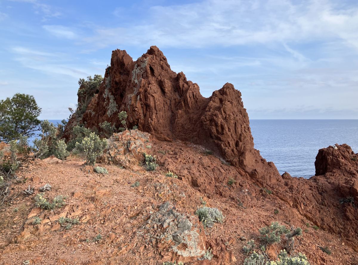 La pointe se trouve à l’est du Massif de l’Estérel. On voit donc vers les montagnes escarpées dans la partie centrale.
