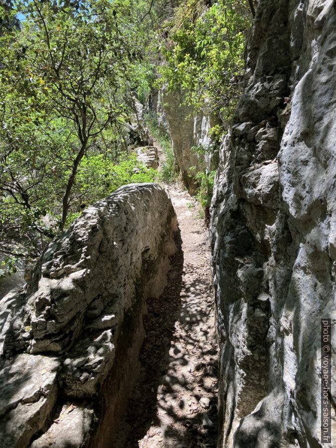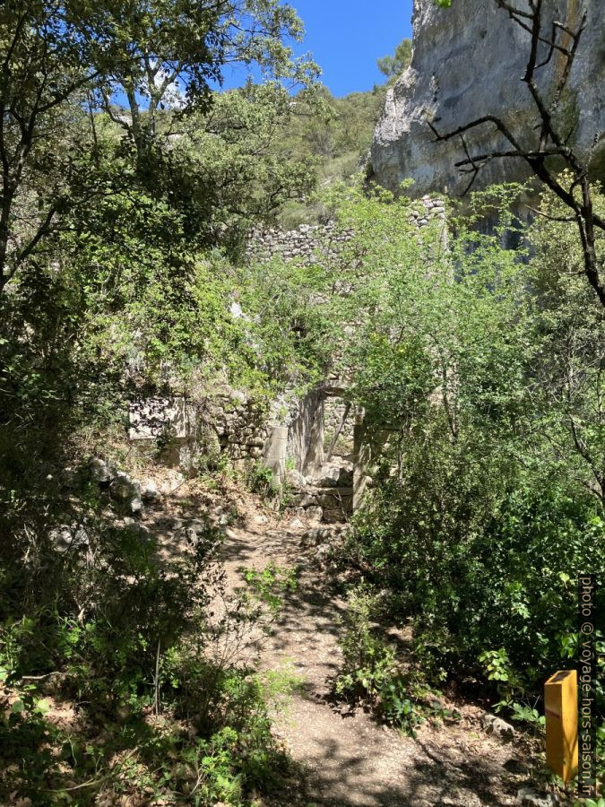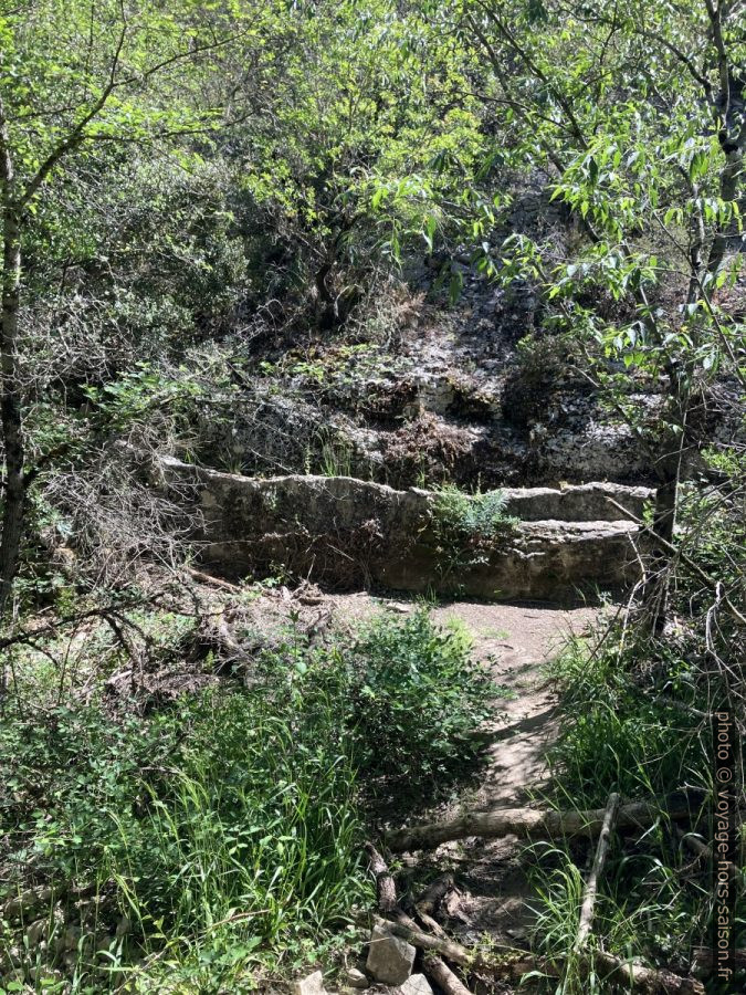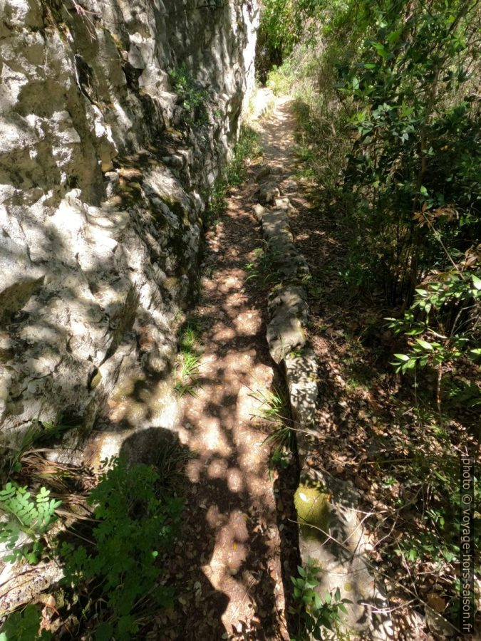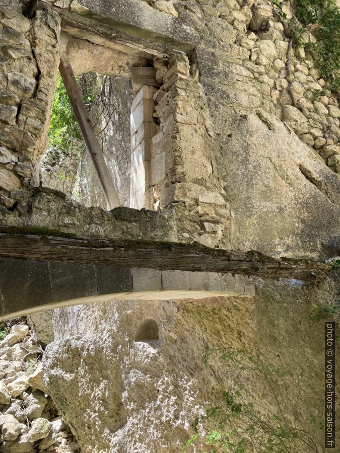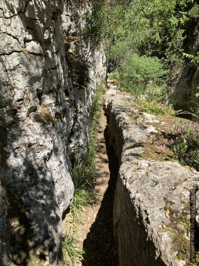 Les premiers signes d’utilisation humaine des gorges apparaissent très vite. Un béal nous accompagne sur des longues portions du parcours. Celui-ci alimentait sans sans doute le Moulin des Grailles plus bas et ensuite cette eau servait à l’irrigation de la plaine.