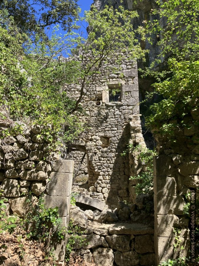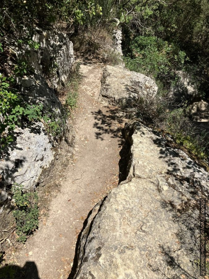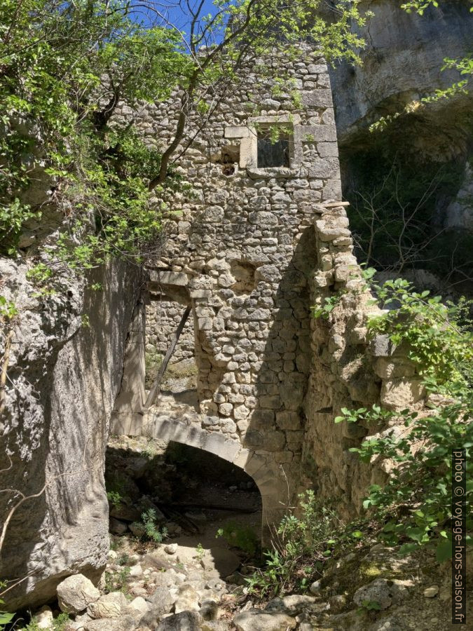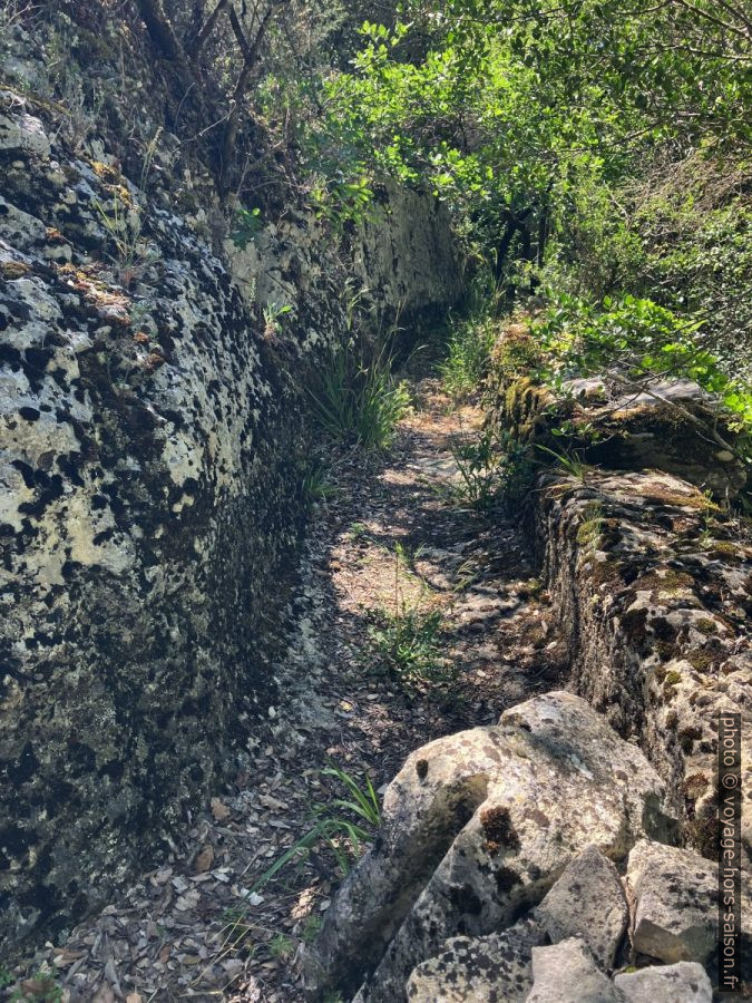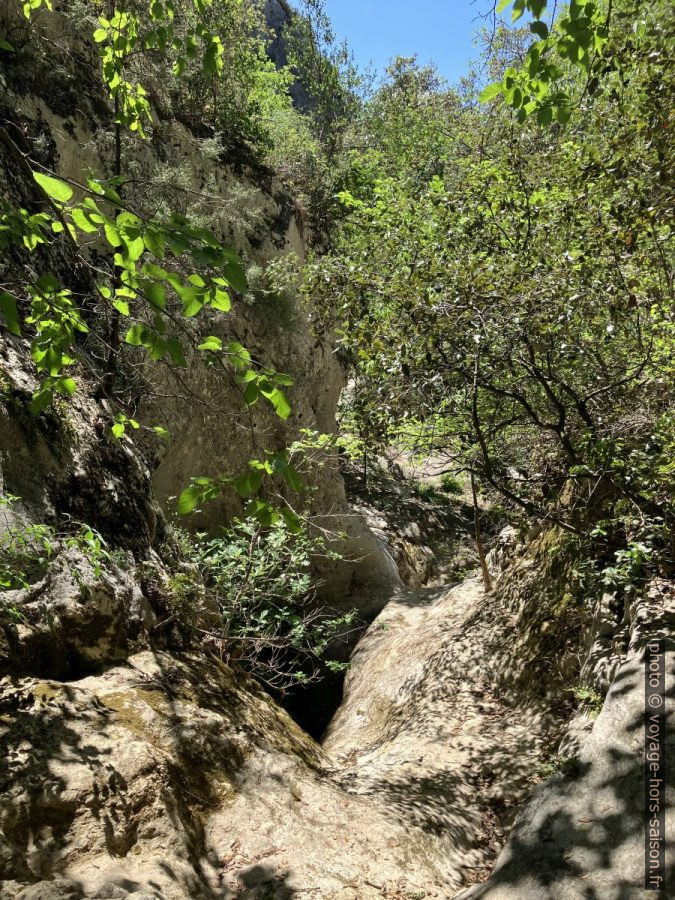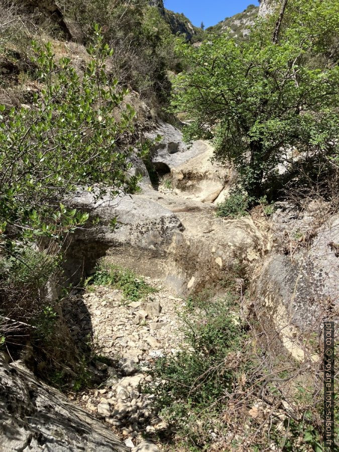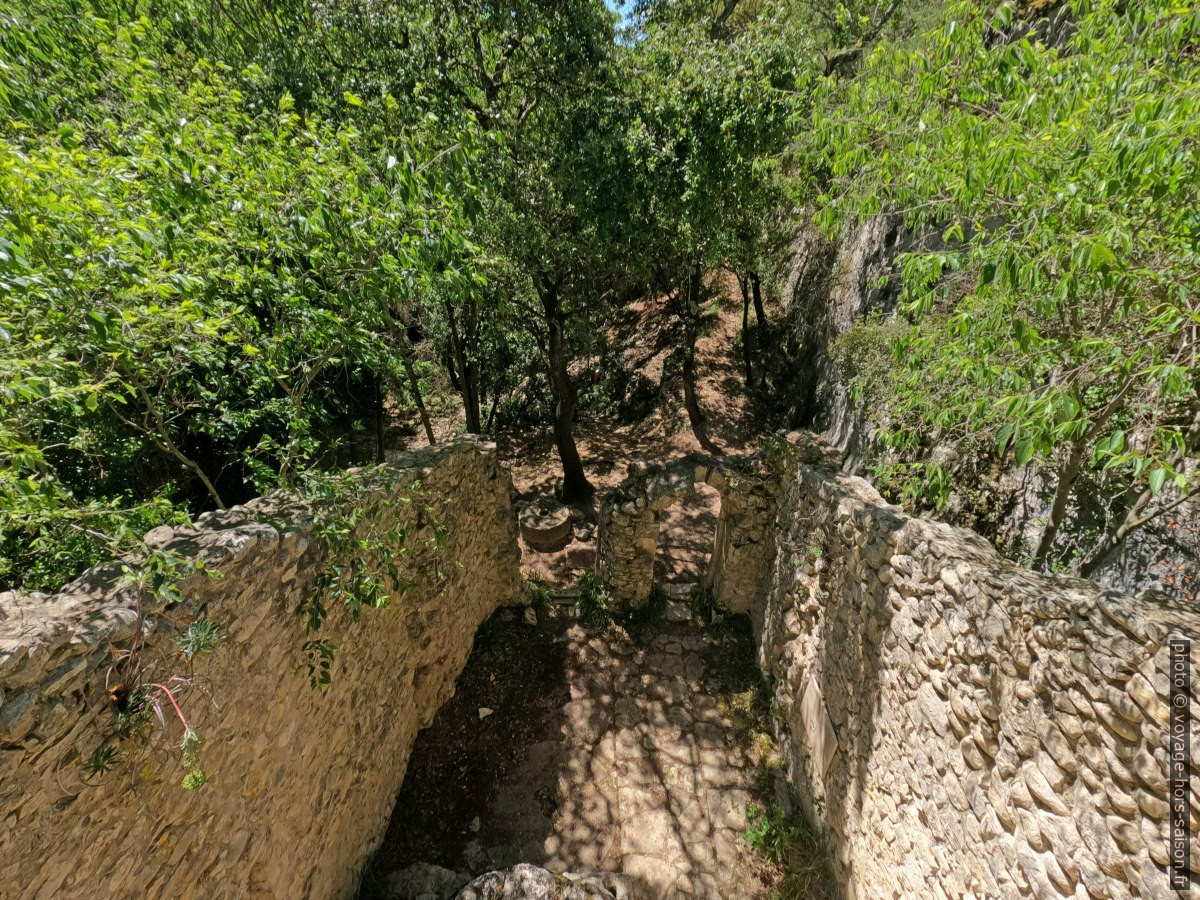 Les premiers signes d’utilisation humaine des gorges apparaissent très vite. Un béal nous accompagne sur des longues portions du parcours. Celui-ci alimentait sans sans doute le Moulin des Grailles plus bas et ensuite cette eau servait à l’irrigation de la plaine.