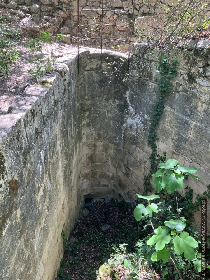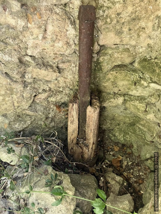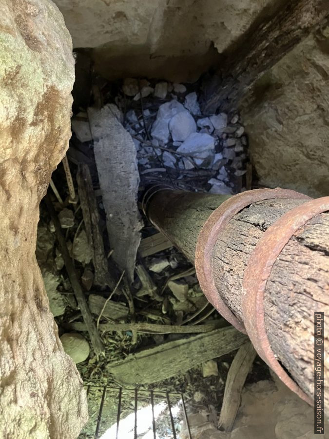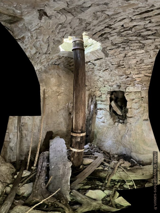Tout en bas se trouve la chambre à eau. On voit l’axe vertical et le trou appelé canon d’oè venait l’eau projetée (bouché par des pierres). La roue à eau devait se situer à la hauteur des débris au sol.