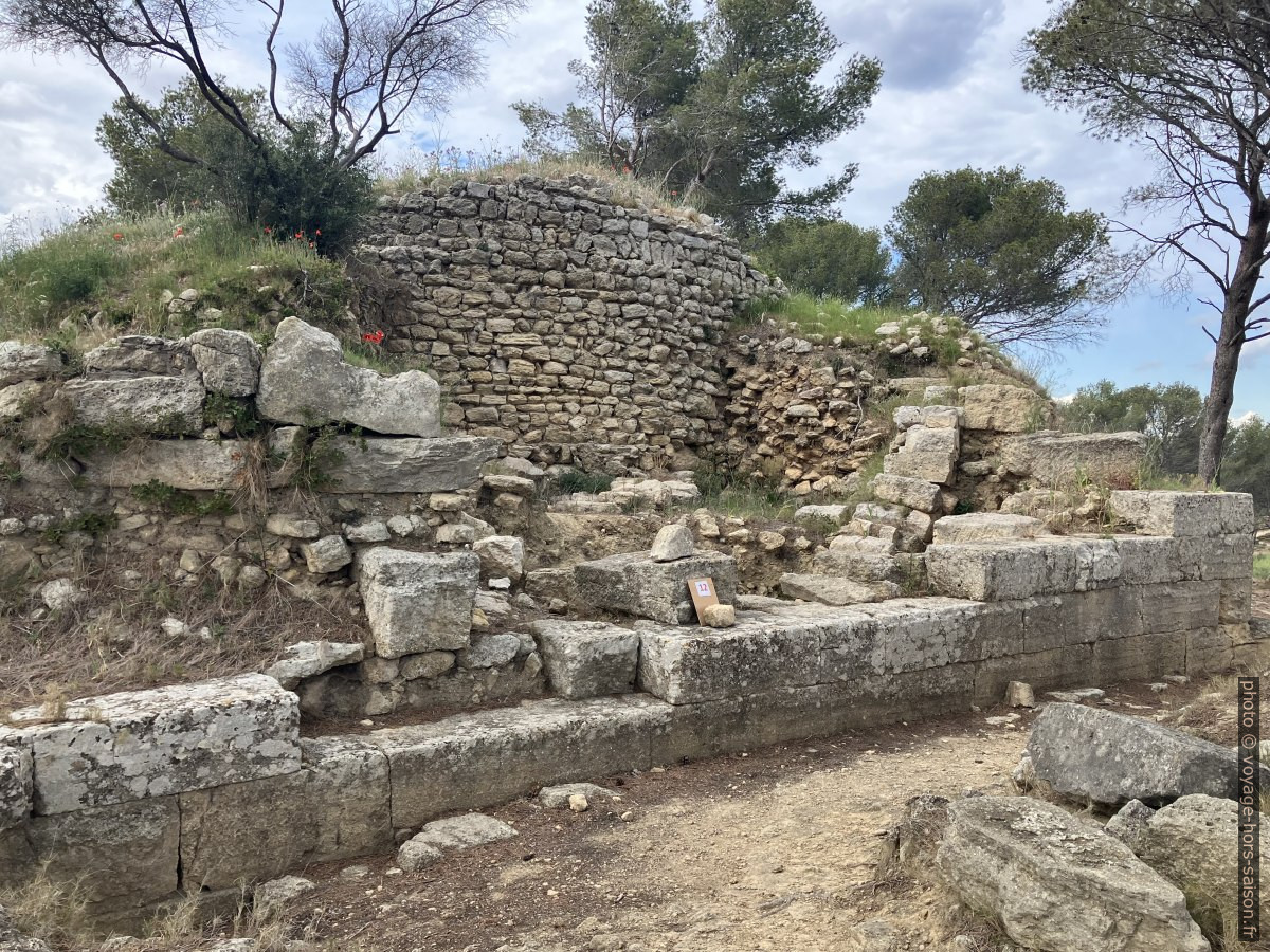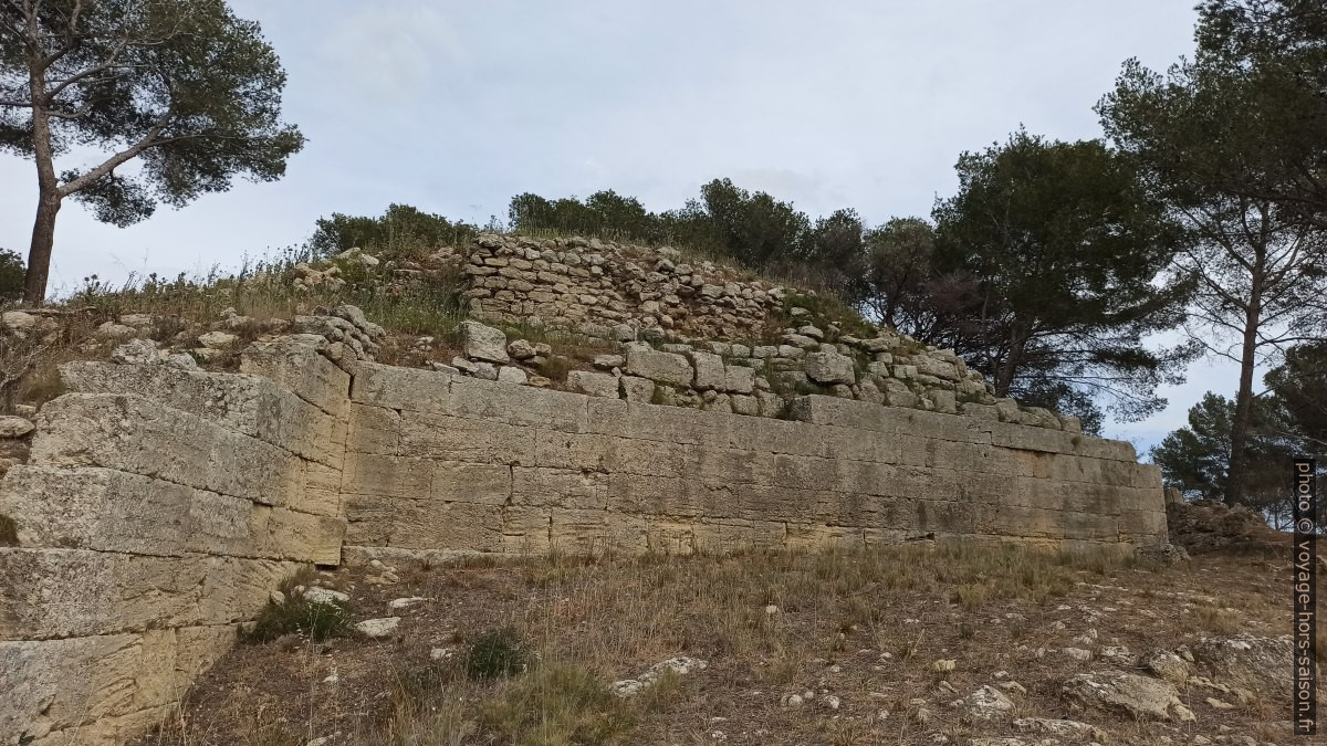On reconnaît à plusieurs endroits au moins trois types de murs. Les blocs proprement taillées datent de l’ère grecque, donc du 2e siècle avant notre ère. Les murs plus hauts sont antérieurs et donc « gaulois », ceux plus bas sont postérieurs, ils sont construit jusqu’au début du Moyen-Âge.