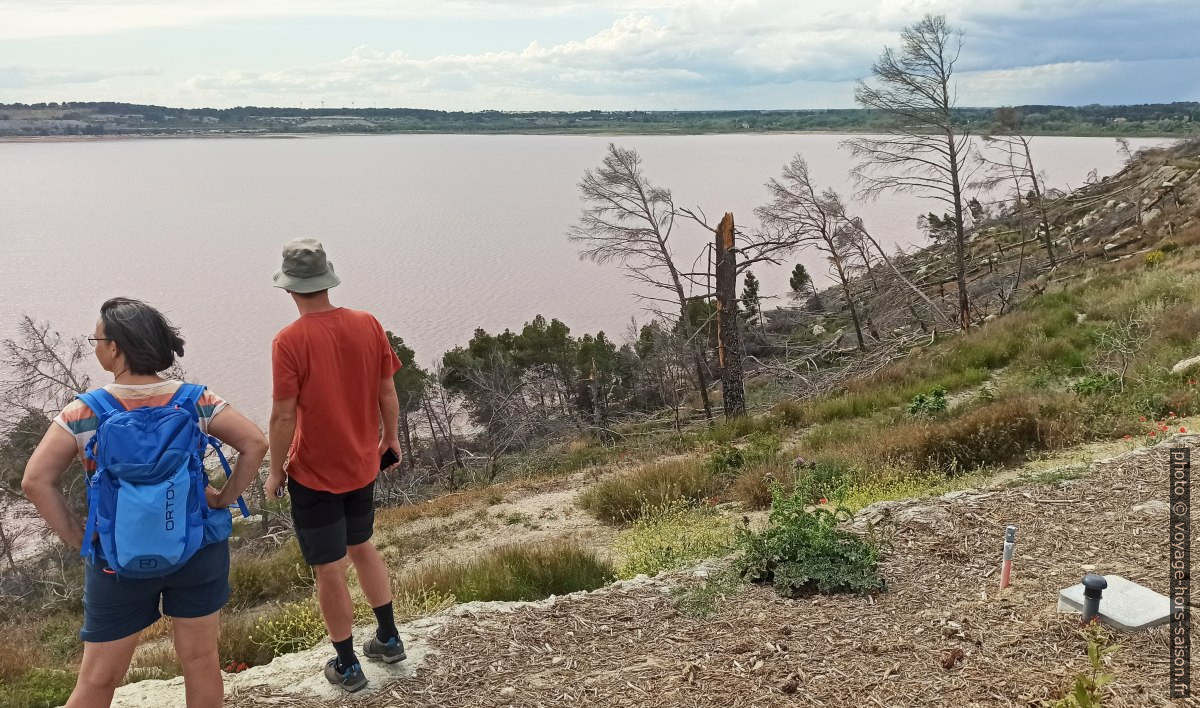On laisse la voiture au parking et on entame une descente vers le bord de l’Étang de Lavalduc. Nous espérons trouver un passage direct grâce aux feux de forêt.