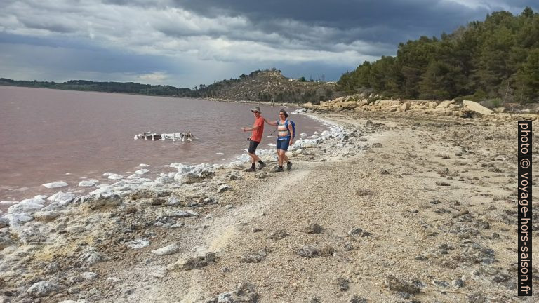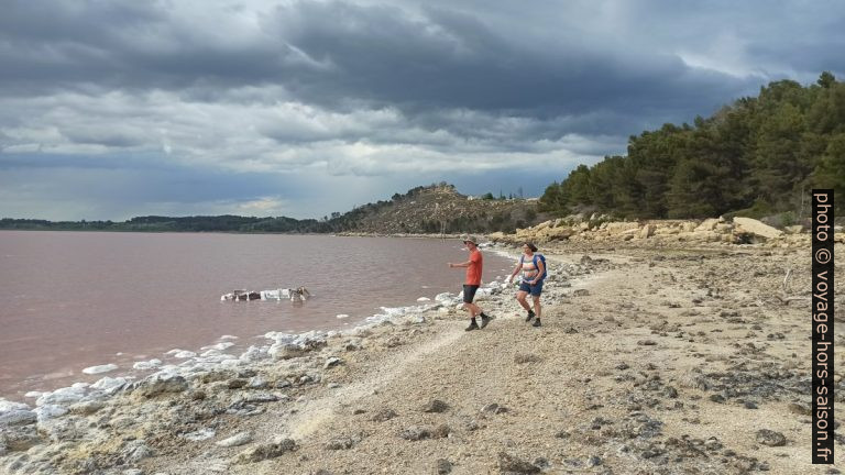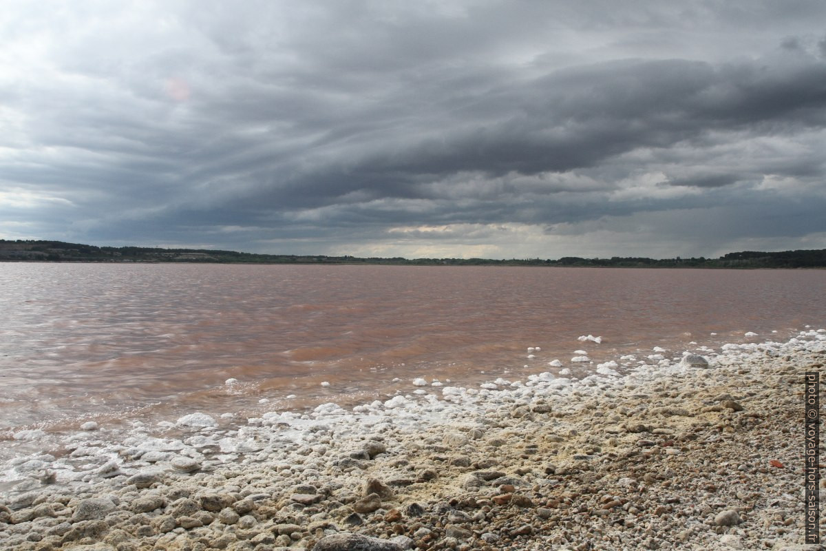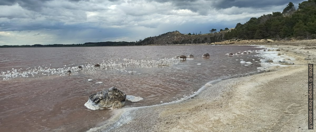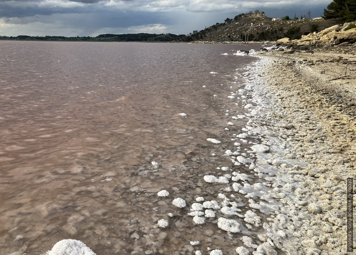 L’eau rose de saumure et du sel cristallisé sur le rivage de l’étang de Lavalduc. Photo © André M. Winter