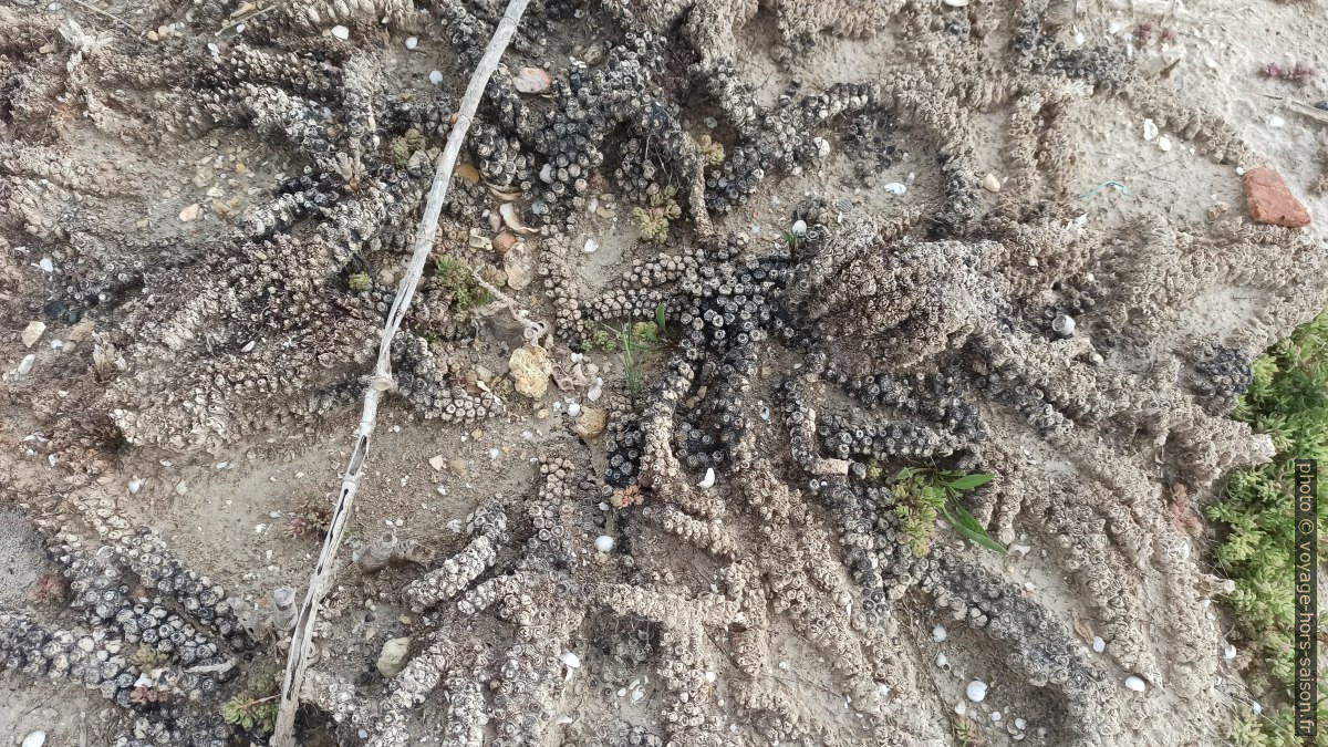 Mais nous arrivons quand même en bas. Nous sommes surpris de la situation complètement changée depuis 2019. Le niveau d’eau du lac de saumure change suivant les besoin de l’industrie et les dépôts sont complètement différents. Moins massifs, mais couvrant mieux les objets et le rivage.