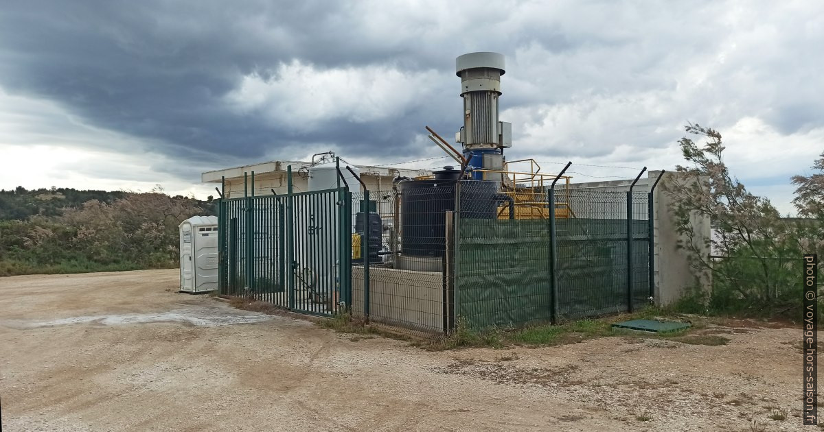 Nous arrivons devant une station de dépotage de bisulfite de soude. Comme précisé plus haut, l’Étang de Lavalduc et l’Étang d’Engrenier plus loin au sud sont des réservoirs naturels utilisés à des fins industrielles. Cette installation a l’air récente, mais le tout a un air de tiers monde.