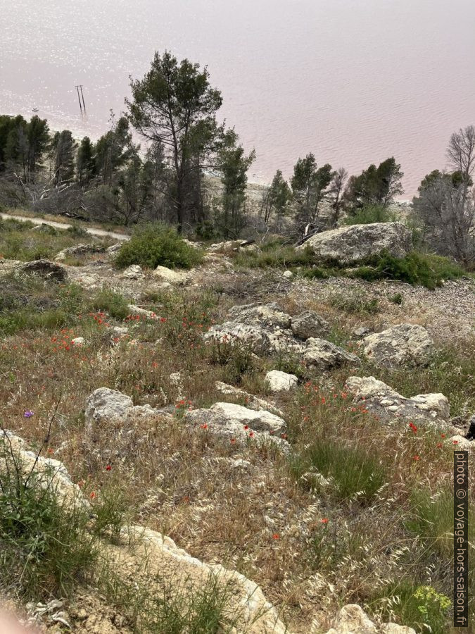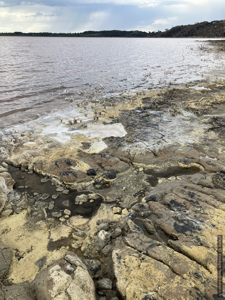 Certaines zones du rivage sont composés de glaise brune foncée couverte de sel blanc et de polen jaune devant le fond d’eau rose. Les couleurs sont toutes très loin d’un lac des Alpes.