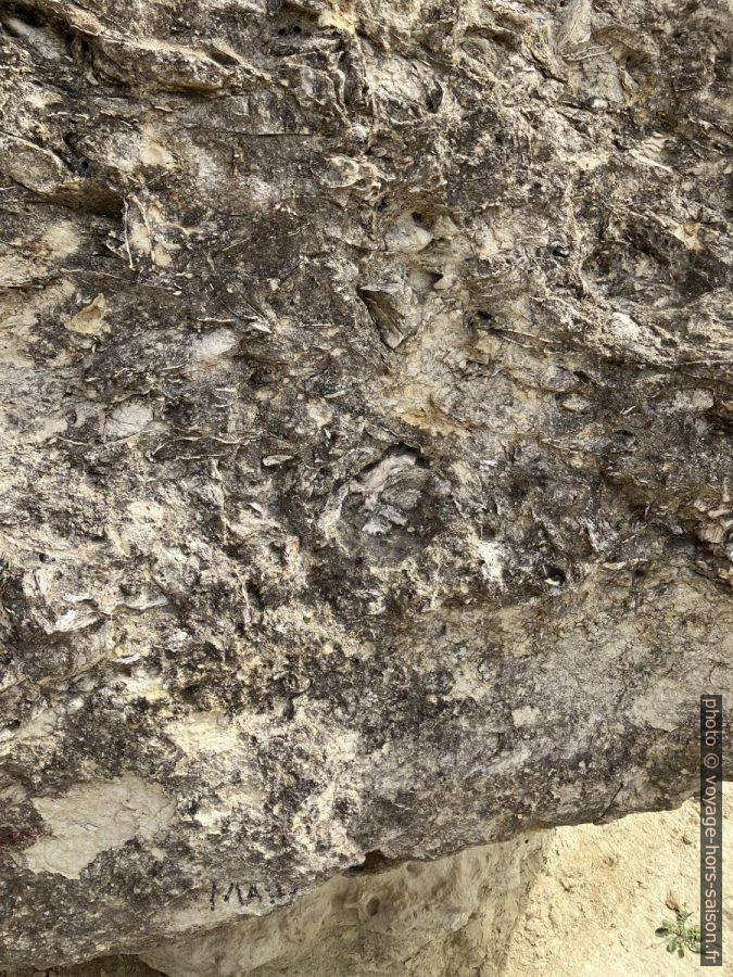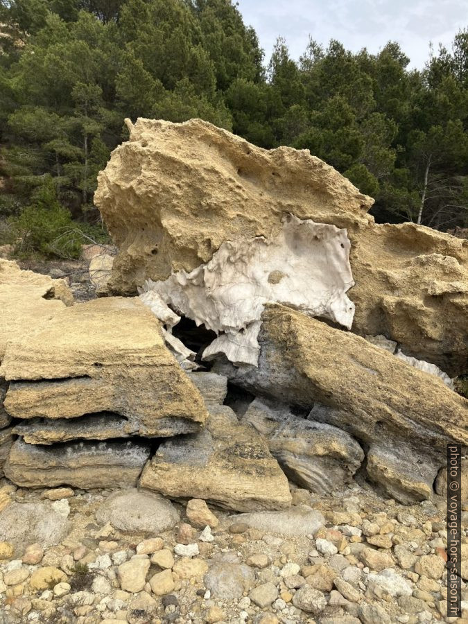 On voit cependant encore les anciens blocs de sel qui restent protégés des eaux de pluie sous les gros rochers.