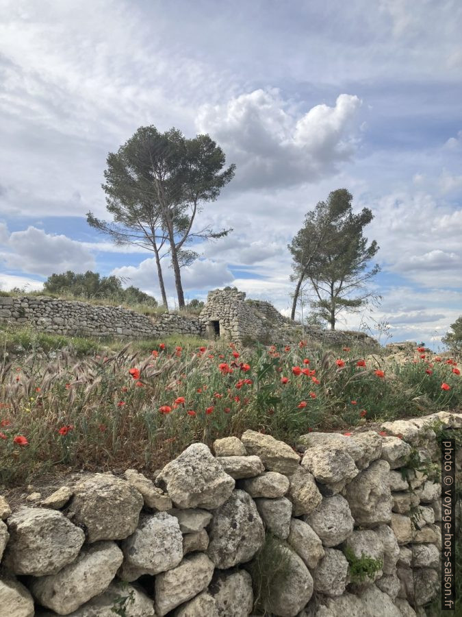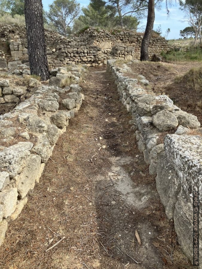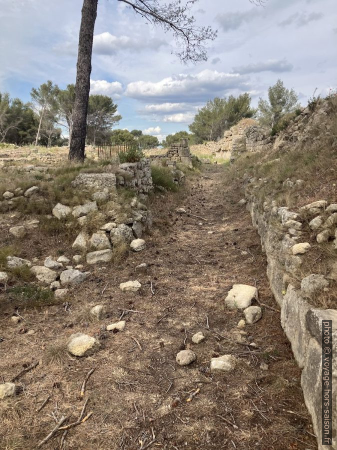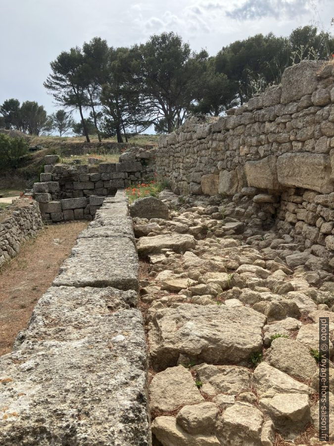 On reconnaît à plusieurs endroits au moins trois types de murs. Les blocs proprement taillées datent de l’ère grecque, donc du 2e siècle avant notre ère. Les murs plus hauts sont antérieurs et donc « gaulois », ceux plus bas sont postérieurs, ils sont construit jusqu’au début du Moyen-Âge.