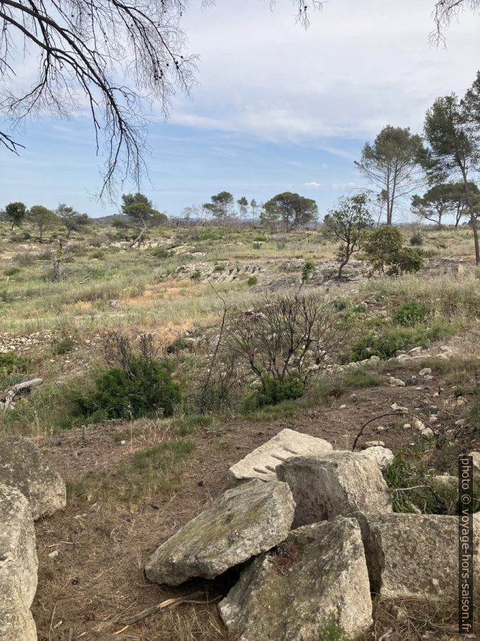 De la ville basse, on peut monter tout en haut de la colline. Le sommet et plat et il était sûrement aussi construit, mais il n’en reste aucune trace. Depuis le feu de l’été 2020, la vue est bien ouverte sur l’Étang de Lavalduc. En bas on voit le chemin qui était jadis en pleine foret. On y passait en 2019.