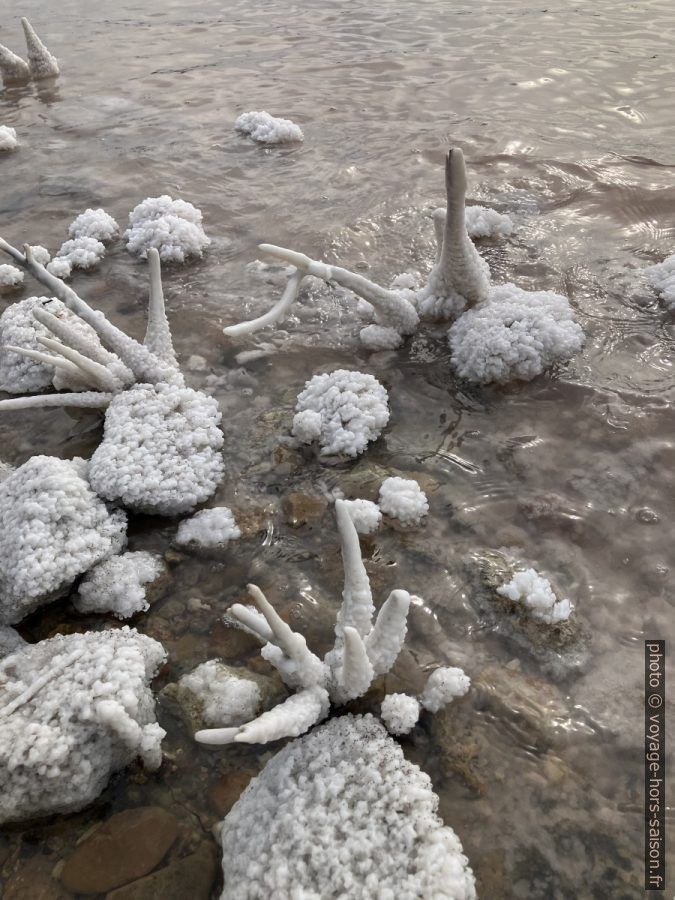 Mais nous arrivons quand même en bas. Nous sommes surpris de la situation complètement changée depuis 2019. Le niveau d’eau du lac de saumure change suivant les besoin de l’industrie et les dépôts sont complètement différents. Moins massifs, mais couvrant mieux les objets et le rivage.