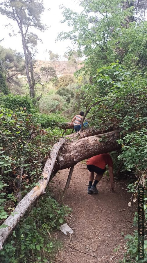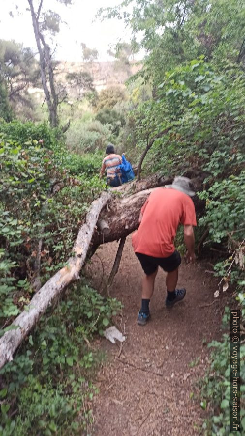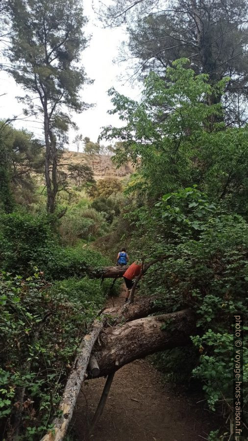 Les chemins ici ne sont pas entretenus. Il faut se faufiler dans les arbres qui tombent encore après le feu de 2020.